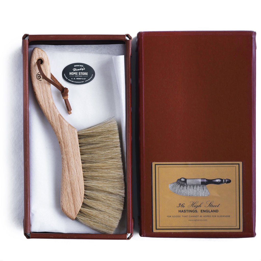 This elegant handmade beech and horsehair brush will deal with all your more up-market brushing needs. It makes an excellent crumb brush for the dinner table; dusts gently around windowsills and ornaments; is excellent between banisters and on blinds; and it also serves well as a car valet brush, for dusting the dashboard, internal surfaces and upholstery - and can easily be stowed away in the glove compartment.