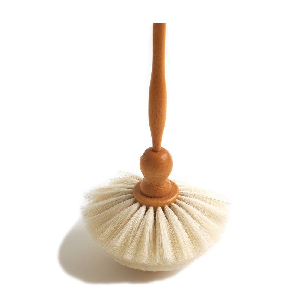 Our handmade long-handled dusting brush holds the perfect cushion of soft goat hair tufts. Each tuft of hair is hand pulled through a multitude of conical holes that have been drilled into the brush's half-sphere head, and then firmly secured with wire. The head is opposable, and can be alternatively fixed at an angle to the pole. Perfect for reaching light fittings, dado plasterwork, mirror frames, and for tackling out-of-reach delicate objects, such as chandeliers.