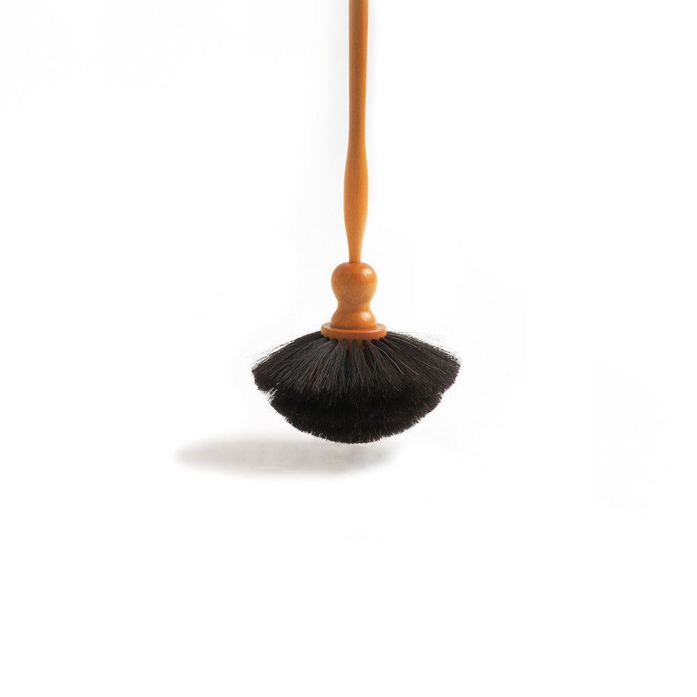 Our handmade cobweb duster is another of our elegant brushes. Its hand-turned waxed beech handle holds the perfect cushion of black horsehair tufts. Each tuft of hair is hand pulled through a multitude of conical holes that have been drilled into the brushÍs half-sphere head, and then firmly secured with wire. The head is opposable, and can be alternatively fixed at an angle to the pole - ideal for when reaching the tops and backs of furniture and pictures, and for reaching inside picture and dado rails.