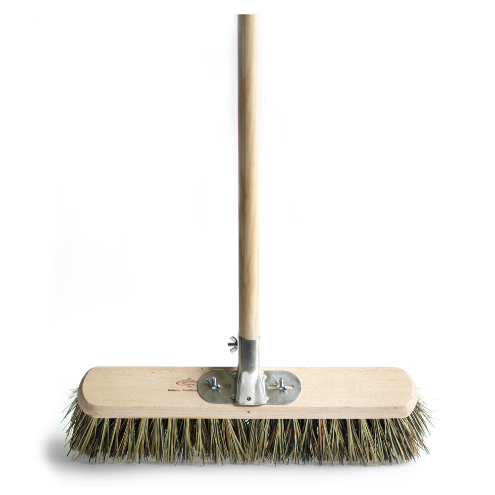 This is the Rolls Royce of yard brooms. It is extra-strong and extra-wide and has a unique industrial-strength clasp fitting that fits pole to broom head. The stiff bristles will deal swiftly with all your yard, terrace and path brushing needs, and the clasp fitting ensures an extra-long life - unlike other outdoor brooms where head and poles habitually become disconnected.