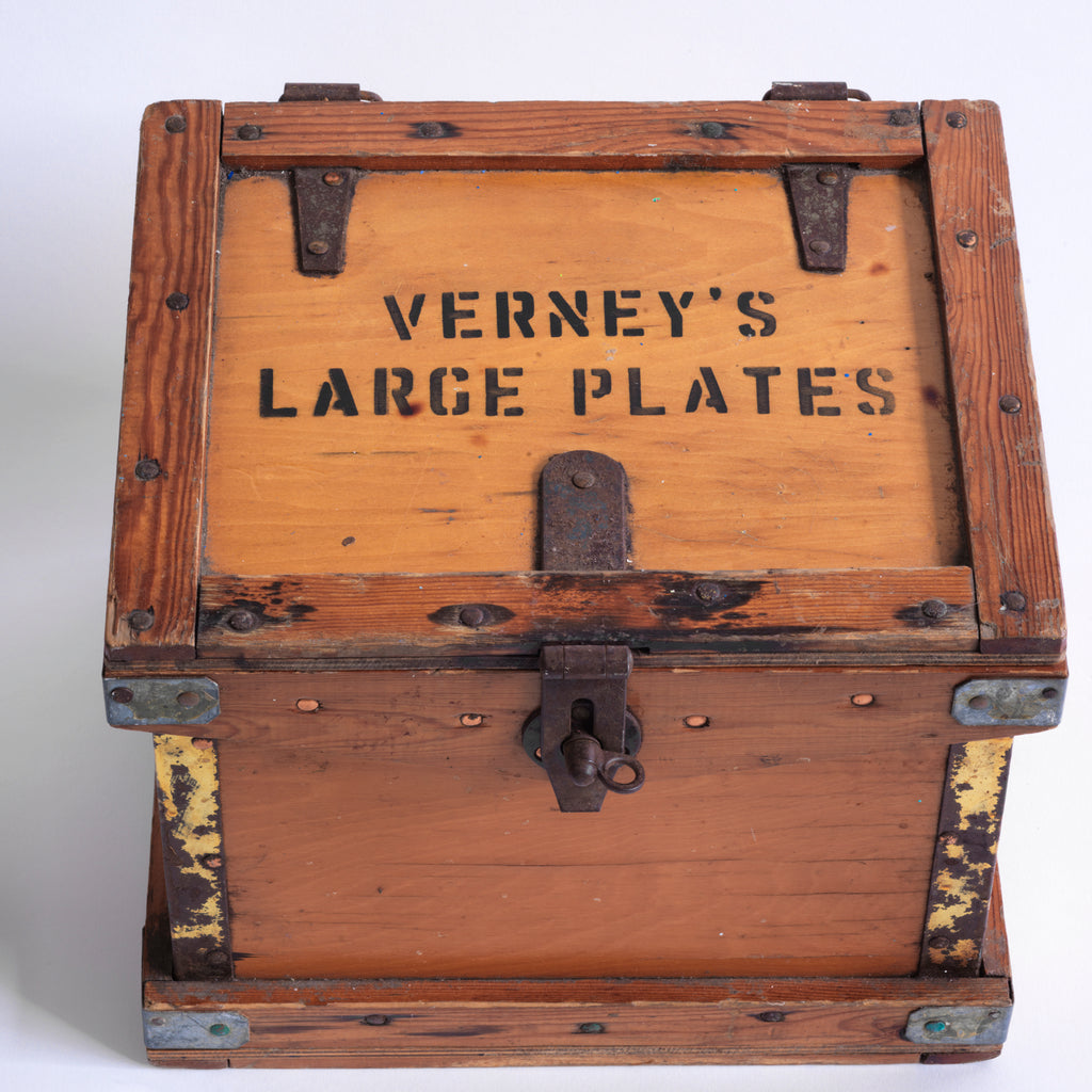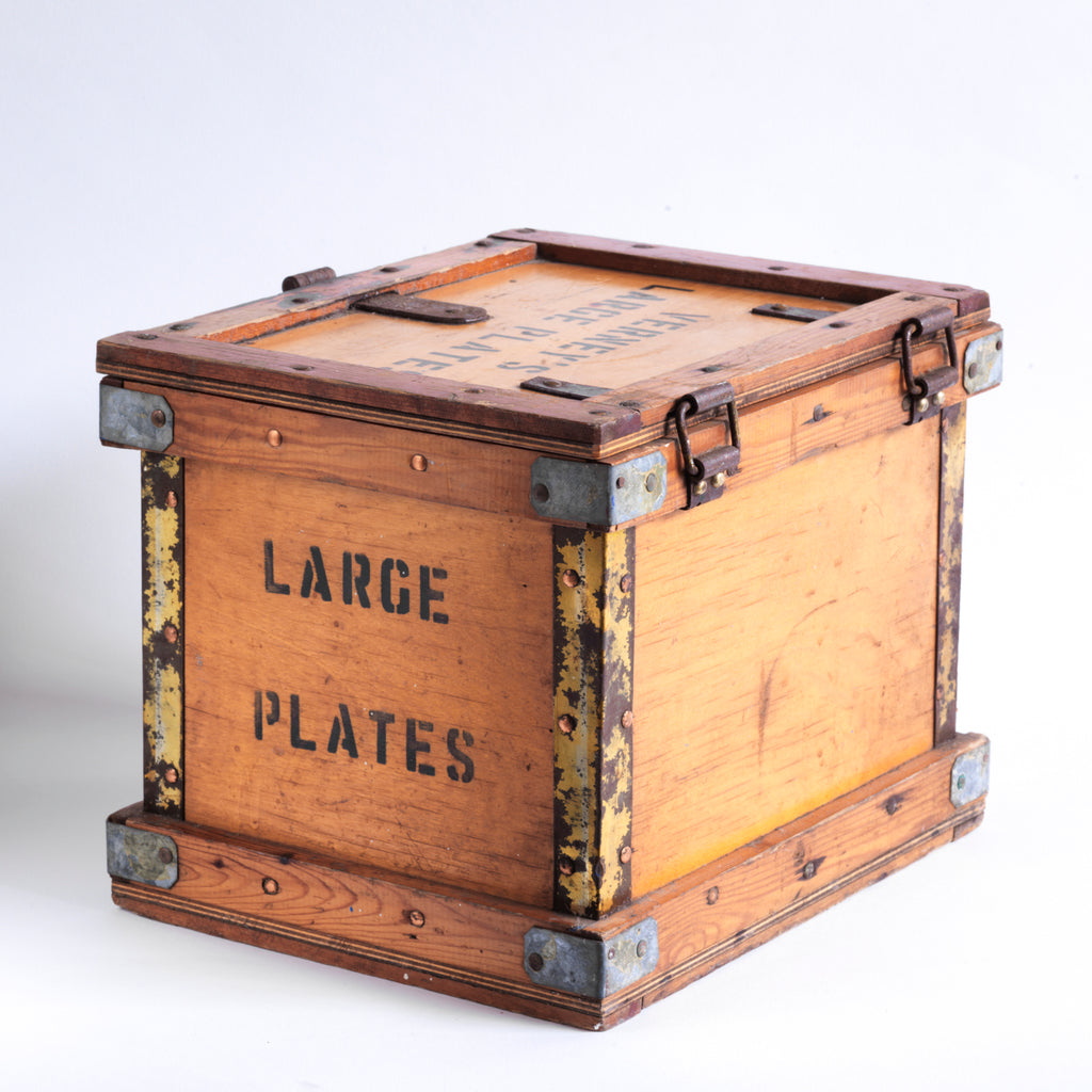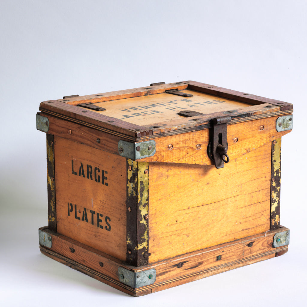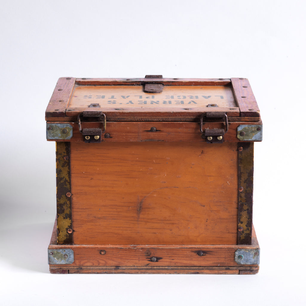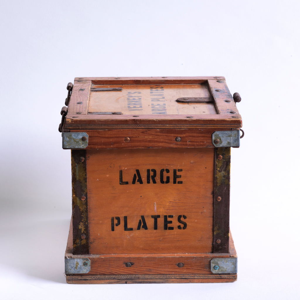 A rare 1920s plates travelling box by Verney's. The lid is stencilled "Verney's Large Plates", and the two end panels are stencilled "Large Plates". It has a bracket hinged lid, reinforced metal trim corners, and a hasp. It would have been used to transport tea plates by train from the countryside to town or to fulfil an order placed by a private house. And considering all the work it has seen, it's in great condition.