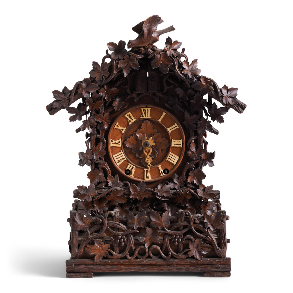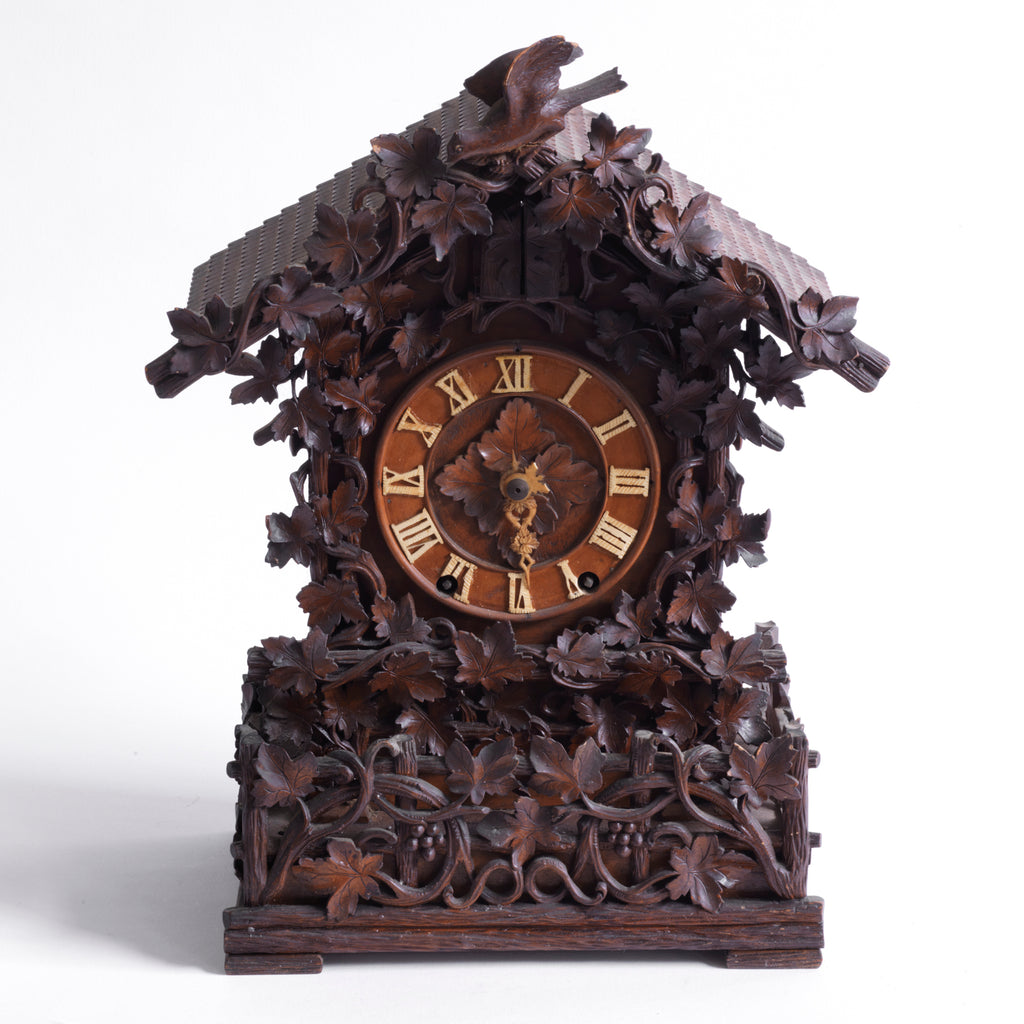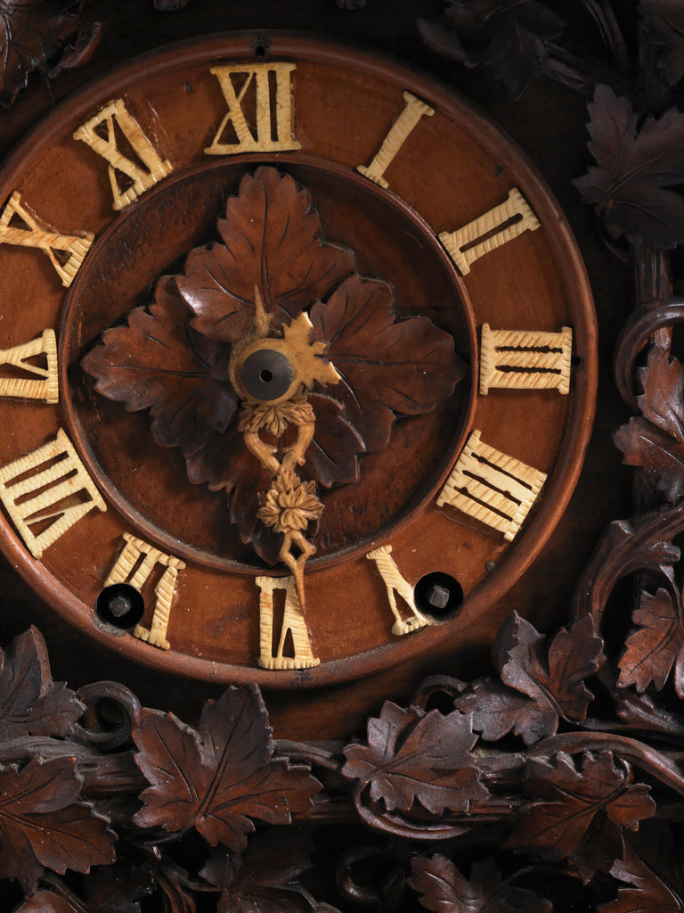 The numerals and hands are carved from bone, and the intricate vine decoration is all hand-carved in wood. The roof even has a pattern of roof tiles, characteristic of the wooden roof tiles found on 19th century Alpine dwellings.