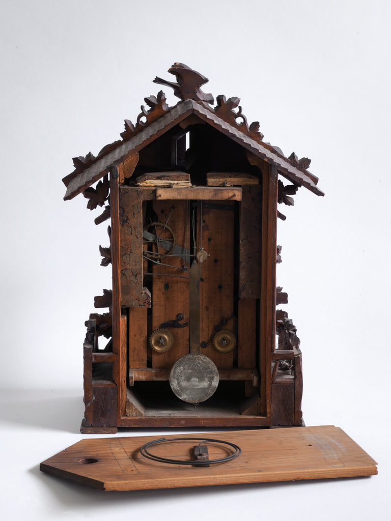 Condition: all the carving is in excellent condition, and the cuckoo is behind its hinged door ready to pop out. One of the clock hands needs a repair (the missing part is with the clock - see image), the bellows inside need a repair, and it's without its wind-up key. The workings inside are all intact but would probably need looking at by a clock repairer to get it ticking again, and they could also supply a key.
