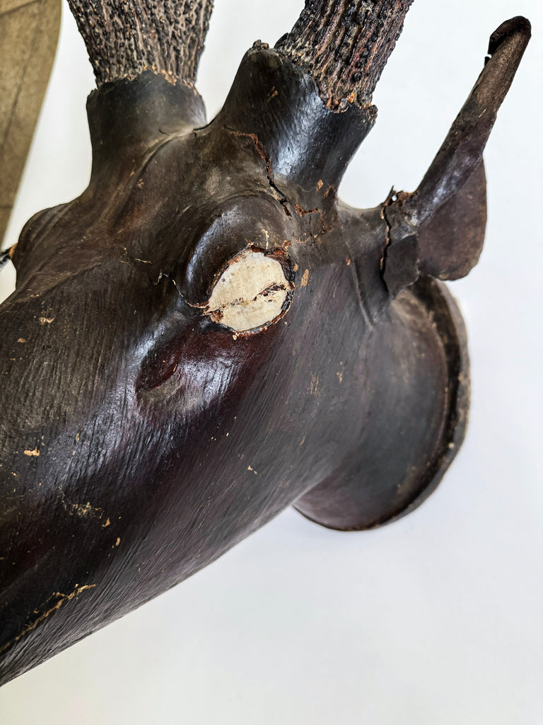A rare and very striking deer head style trophy fashioned from papier-mâché-like composition and with reel deer antlers, that was most likely made in the 19th century in colonial India, during the days of The British Raj. The large antlers are sinuous and graceful and belong to the Sambar deer, a large deer native to the Indian subcontinent and South East Asia. The head is crafted from a form of papier-mâché, has a beautiful patina and is with its original painted finish. It has one glass eye topped by long eye lashes, the other it lost along the way, and the socket now wears an eye-patch. The whole is mounted on a hardwood base that has a hole for hanging.