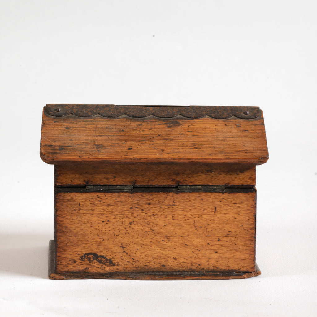 A charming Victorian naive model wooden house savings box that resembles a Scottish bothy, with crimped metal trim to its roof, along with metal windows and front door. The roof is hinged and opens up - there is a lock, yet we do not have the key. This little house once stood on the dresser in the upper living room of The Tudor House, along with a small hamlet of other wee houses - see images.