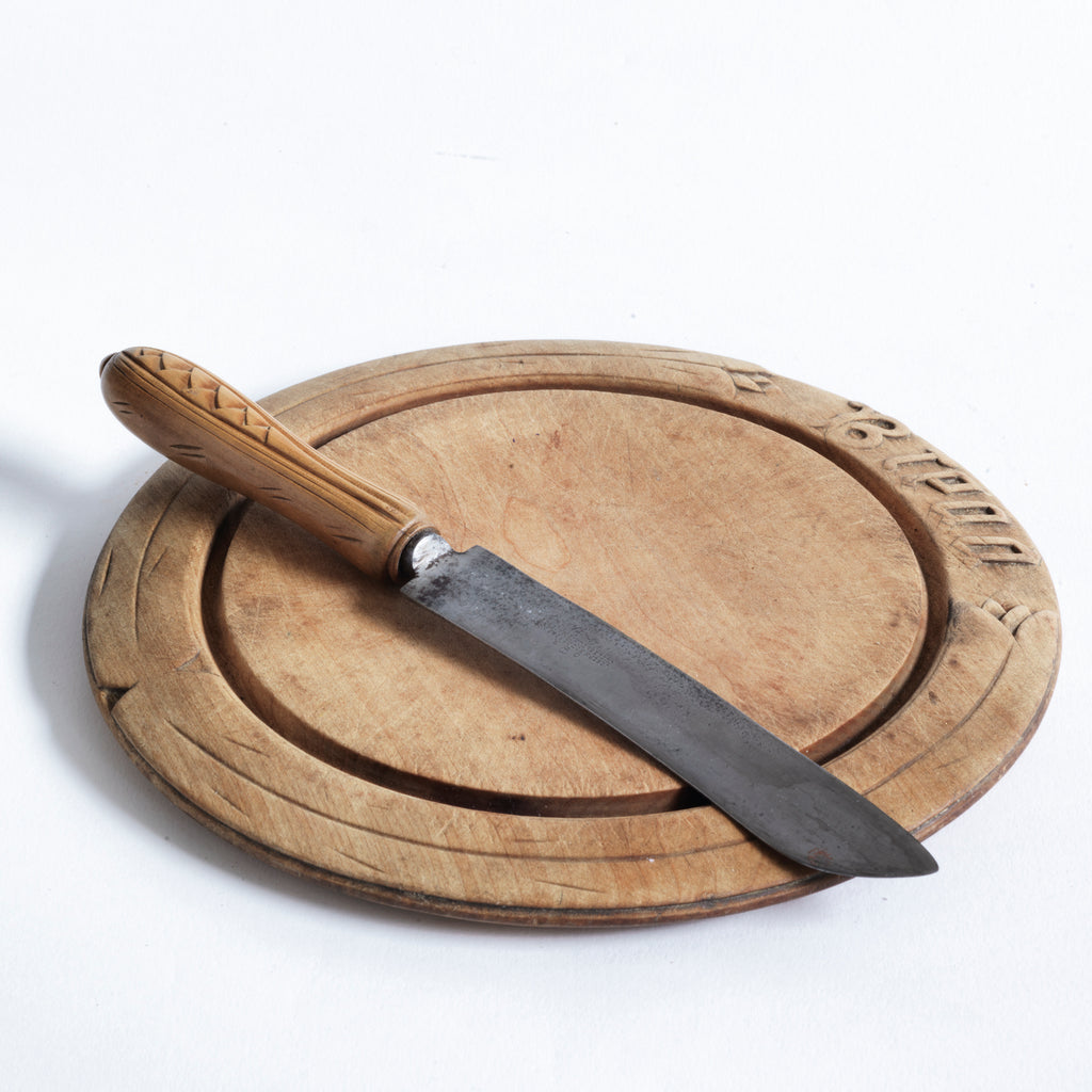 Condition: all very good. The knife has seen well over a hundred years of use and has a wonderful time and hand-worn patina, both to the handle and blade. The breadboard is is also in great condition and has a wonderful patina.