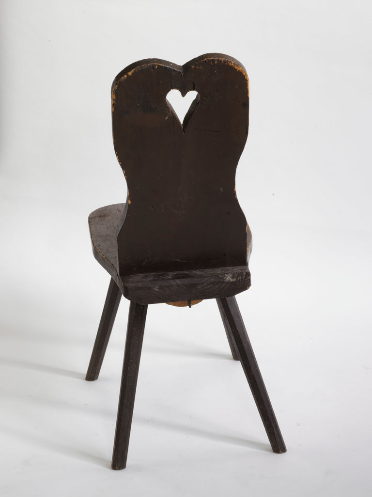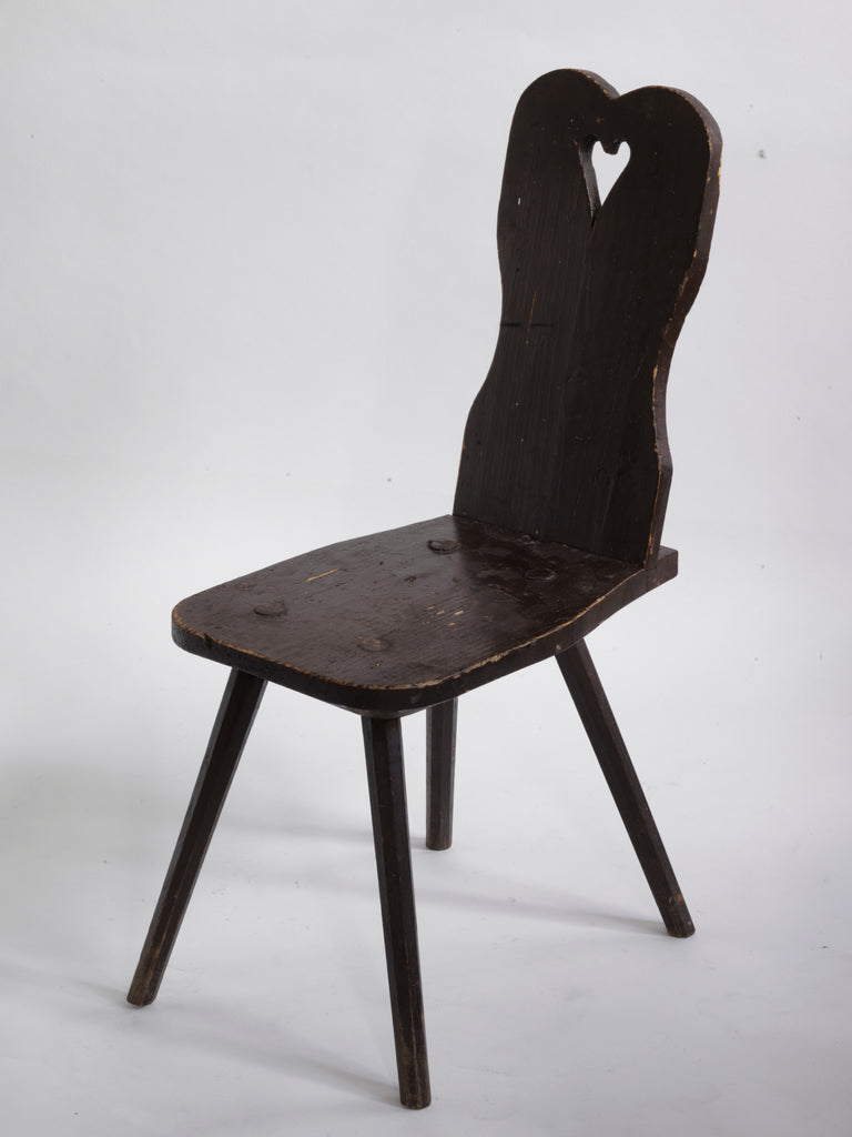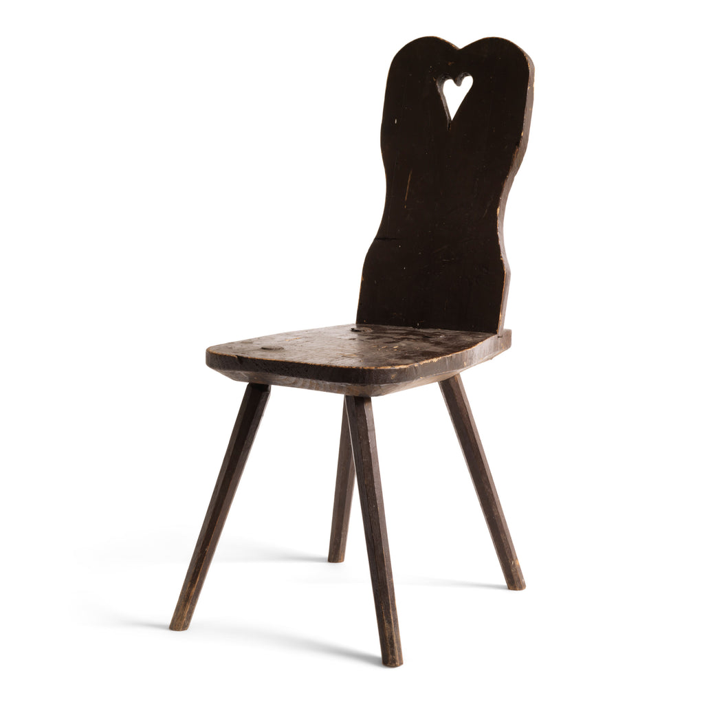 A Romanian alpine folk art style stick-leg chair with high back and charming heart detail, most likely from the Carpathian Mountains - and with its original brown painted finish.