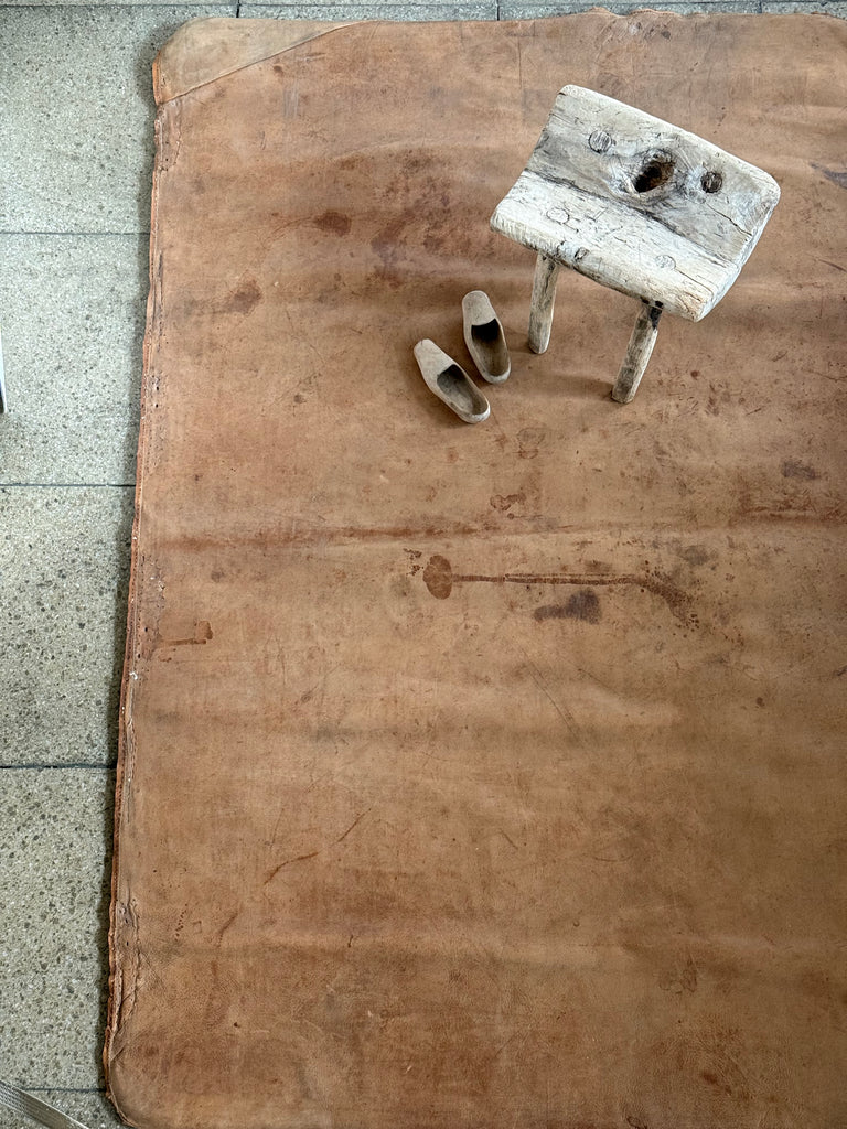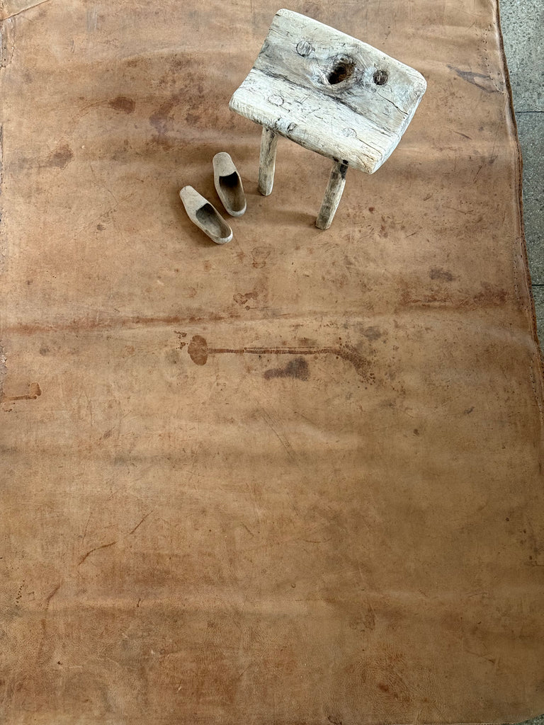 A large and very handsome soft leather mat with lovely time-worn patina, converted from a 1930s gym mat. The back is cloth covered and inside there is slim fill of padding, making it extra soft to walk upon. It has some historic marks and stains across the leather, stitch holes along its edges, plus a sewn repair at one corner, yet this only adds to its beauty. It was once in the top floor bedroom of The Tudor House, alongside the box beds - see last image.