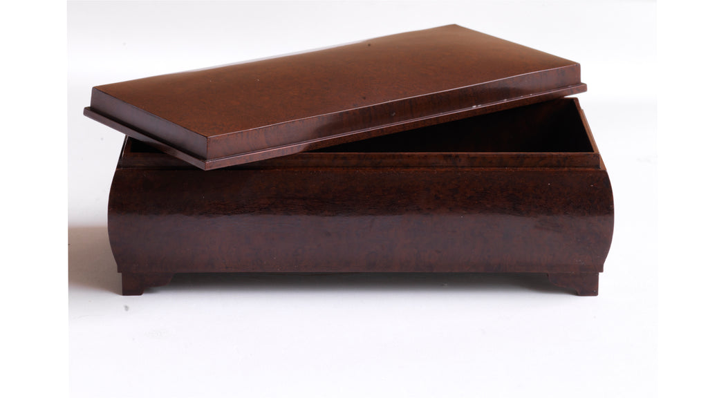 Bakelite was the new modern material of the 1930s and was usually applied to contemporary designs. Here it has been press-moulded to make a traditional antique style box that would have traditionally been made of wood. An experiment that didn't catch on - presumably because those that liked 'antiques' liked them made of wood. Nevertheless, this box demonstrates the experimentation that was taking place in the brave new world of the early twentieth century, as it embraced its new-found love: plastic. This unique box is in a rich, dark bitter-chocolate brown, has a wonderful high-polish finish, and is in immaculate condition.
