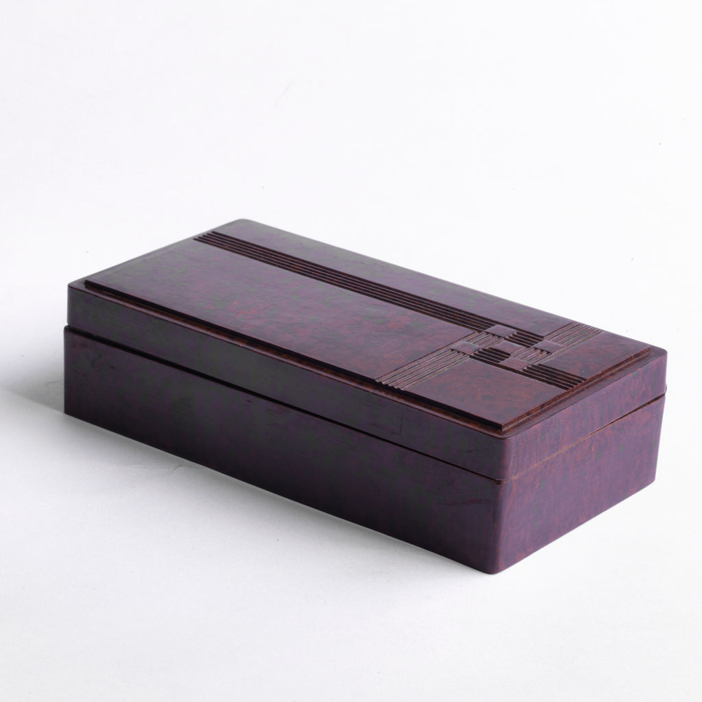 A striking 1930s Bakelite box with a hinged lid applied with a press-moulded modernist motif, and with "Made in England" to its underside. Its stepped and streamlined rounded edges make it a good example of early twentieth century Art Deco influenced Modernism. As a design principle Modernism promoted sleek, clean lines and eliminated decorative additions that were purely for the sake of embellishment. It was a new world that took its forms from technology, factories, practicality and usefulness. Form certainly follows function in the design and material that was used to make this box.