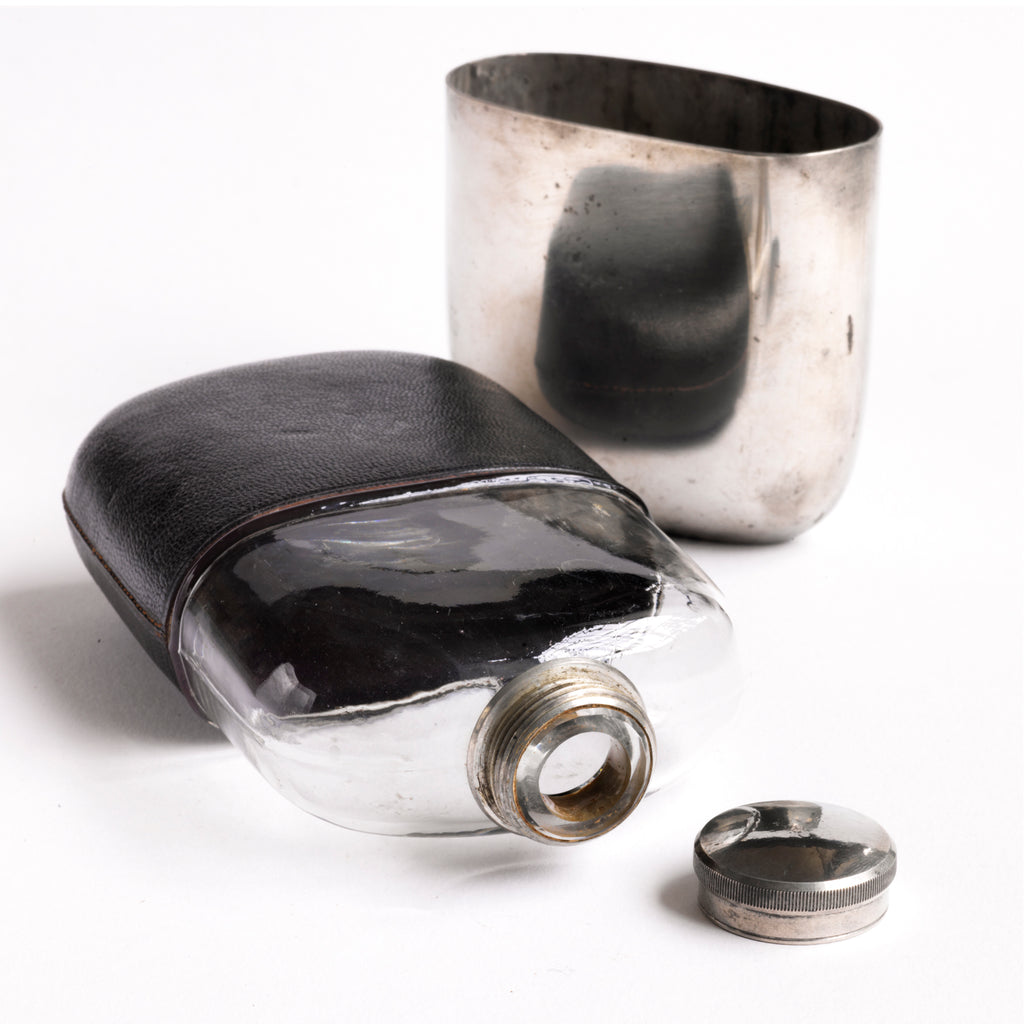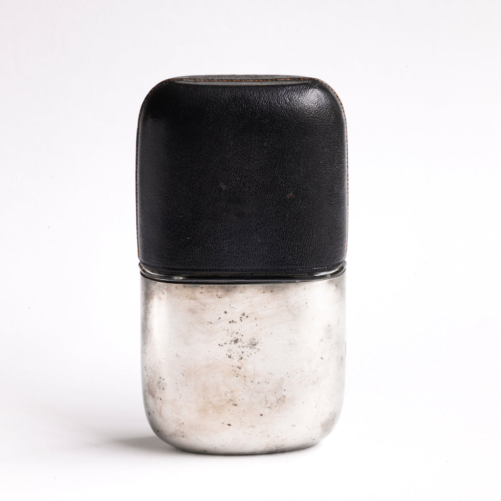 A very handsome Edwardian silver plated, glass and black leather 1/2 pint hip flask with a screw-cap top by "James Dickson & Sons Sheffield". This one is super-large and has a particularly striking pared-back design. The clear glass body is half covered with leather, the upper half has a detachable silver plated EPNS cover that also acts as a cup. See images.