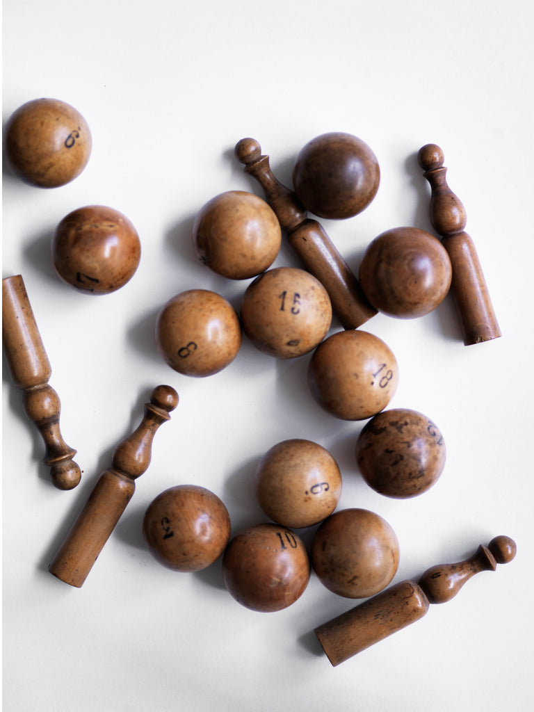 A collection of beautifully made antique miniature numbered balls and skittles, each hand crafted from polished boxwood, and each a beautiful example of late 19th century treen.