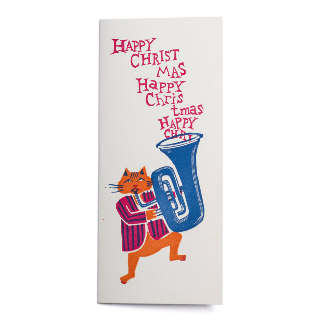 We have sourced a small quantity of these very rare original 1960s vintage hand block-printed Christmas cards. Design no.13, a cat playing a tuba, was designed by Robert Lobley and printed at The Magpie Press in the 1960s. This beautiful handmade card is unique to our store and is the ideal Christmas gift in itself - no one else will have one!
