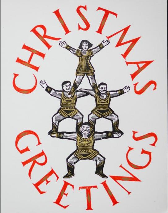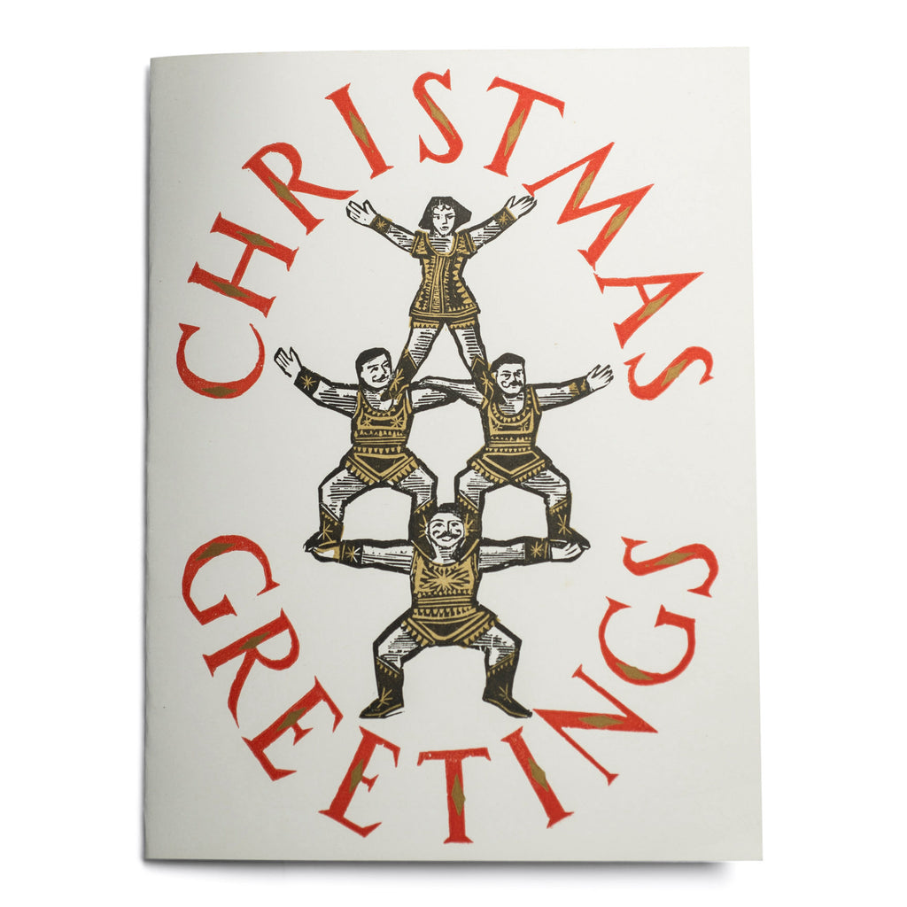 We have sourced a small quantity of these very rare large original hand block-printed vintage Christmas cards. Design no.12 is of four acrobats encircled by Christmas Greetings and was designed by Robert Lobley, and printed at The Magpie Press in the 1960s. This beautiful handmade card is unique to our store and is the ideal Christmas gift in itself - no one else will have one!