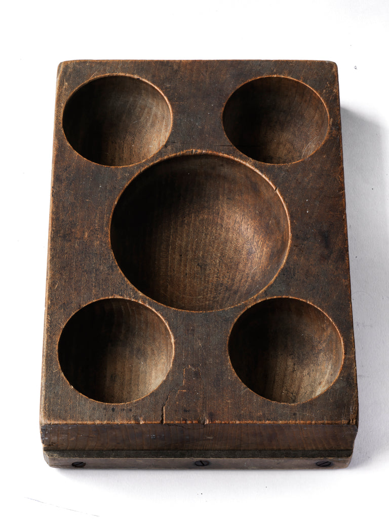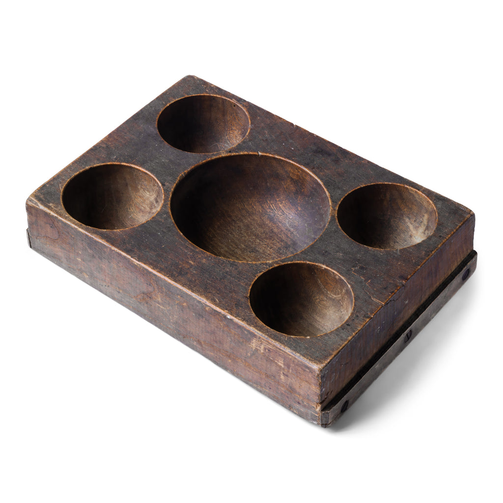A very handsome Edwardian coin organiser that would have once stood on a grocery store counter - as a handy dispenser for small change. Carved from a single block of oak, with three hollowed-out half-spheres, it has been polished smooth from its years of use, and has developed a wonderful hand-worn patina. Its shop work days may be over, yet it still makes a great organiser - for change, keys, or for all those bits and pieces that accumulate in the kitchen or on the desk.  Its sculptural, tactile and pleasing form make it a great addition to the modern home.