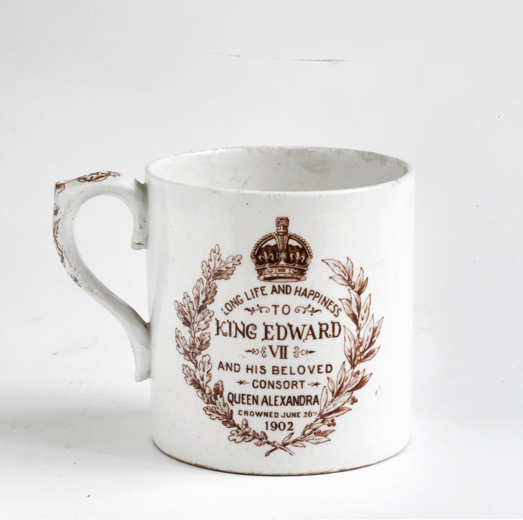 An Edwardian Edward VII coronation mug with tin white glaze by Royal Dolton, made to commemorate his coronation in 1902. "Long life and happiness King Edward VII and his beloved consort Queen Alexandra crowned June 26th 1902" amid a crown of oak and laurel leaves illustrates the rear; and a portrait of Edward VII and Queen Mary and "E R" decorates the main body of the mug - along with flags, a lion, a unicorn and swags of roses.