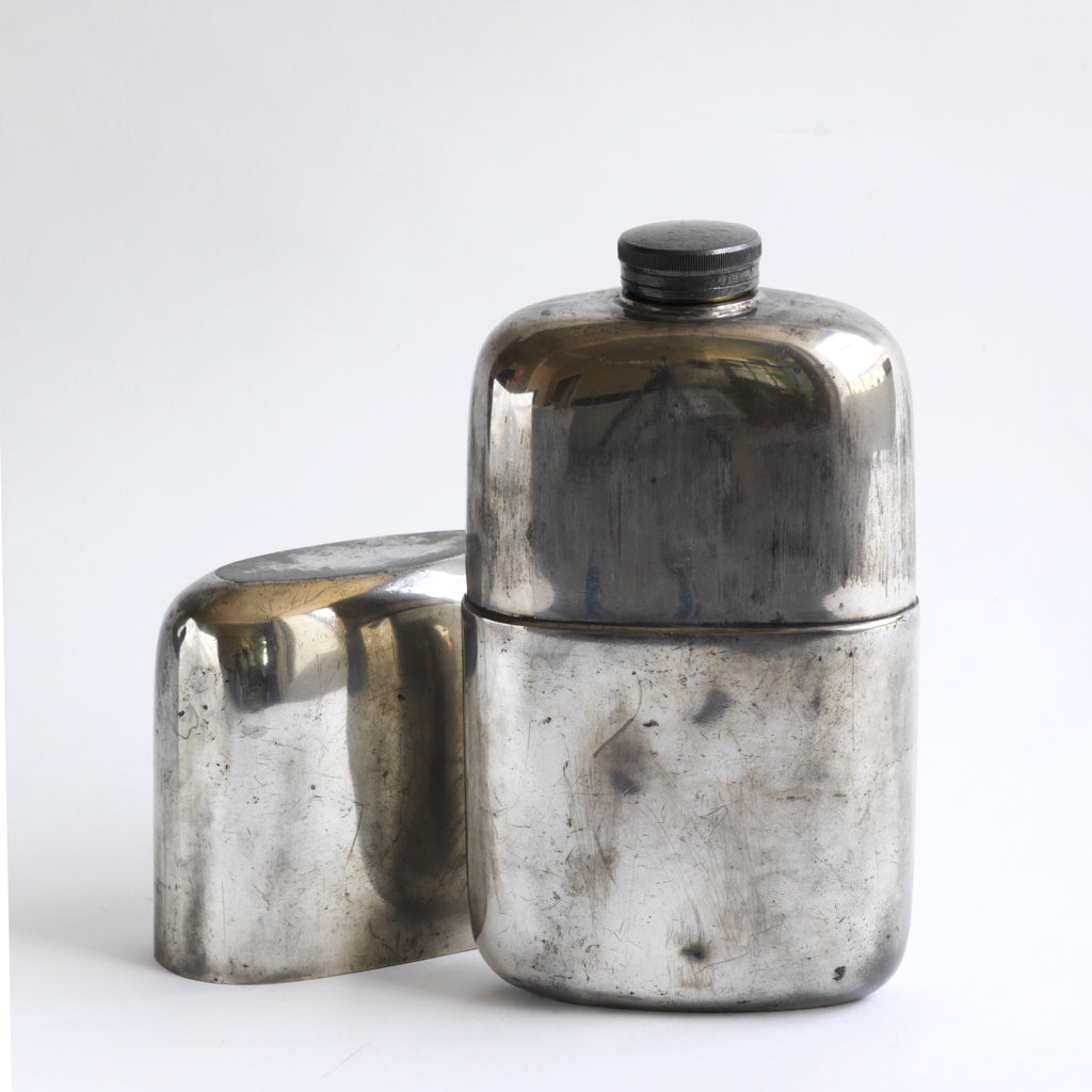 A good-looking Edwardian silver plated hip flask with a screw-cap top by "James Dickson & Sons Sheffield". This one is super-large and has a particularly striking pared-back design. The upper half has a detachable silver plated EPNS cover that also acts as a cup.