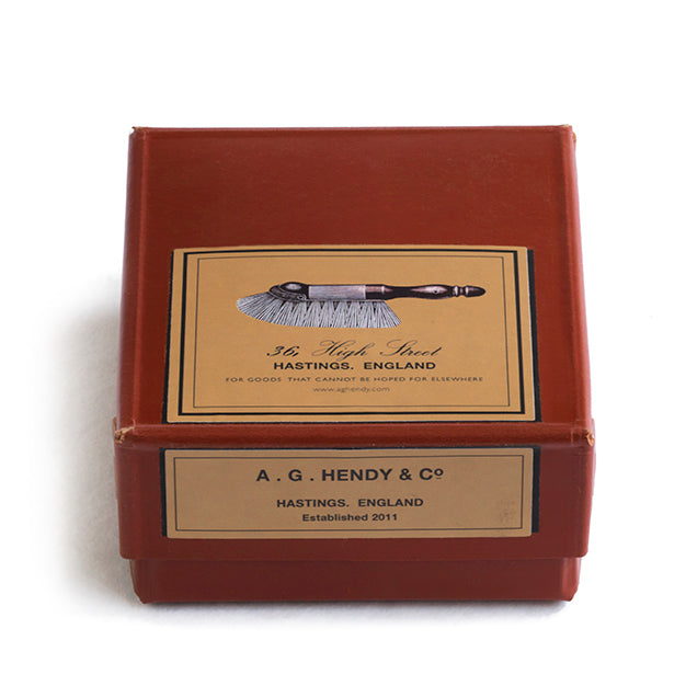 Our A G Hendy & Co branded boxes will make your gift that extra special. Constructed from vulcanized cardboard with an internal aluminium frame and rivets for extra rigidity, they were originally made for a well-known central London museum in the 1950s to be used as archive boxes. Never used, they were recently discovered in a forgotten store room belonging to the museum. Their ox-blood colour and heavy-duty construction reflect our hardware store aesthetic, which makes them the perfect container for that special A G Hendy & Co gift. Once unpacked, the box offers further very useful storage solutions for today’s office and home.