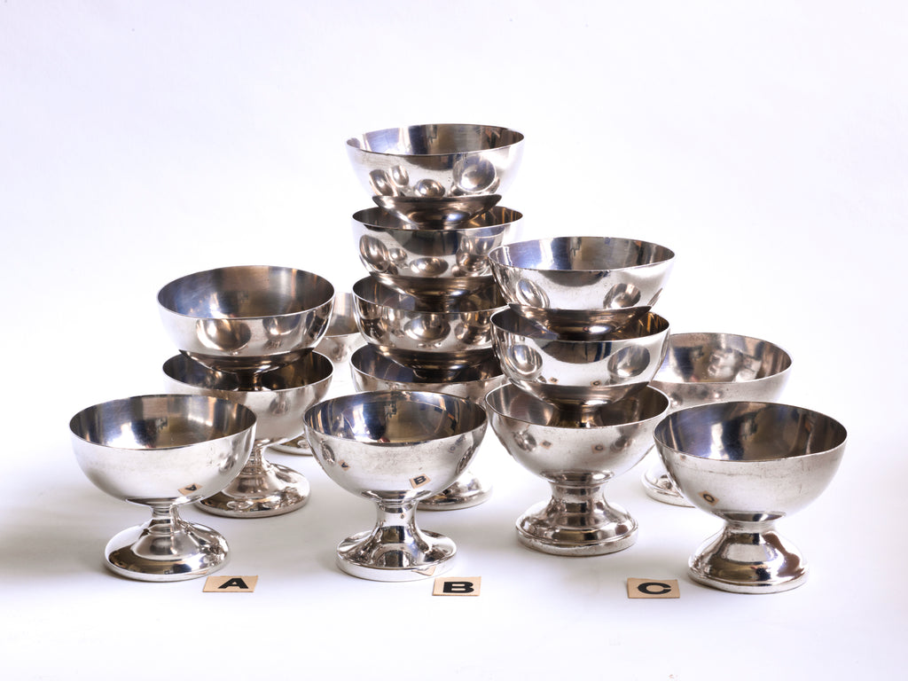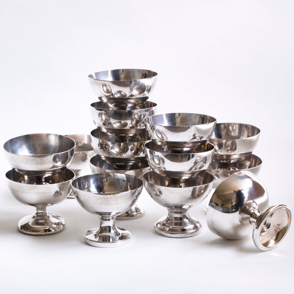 Just 2 left! A collection of vintage silver plated ice cream coupes, some ex hotel and others ex officer's mess.