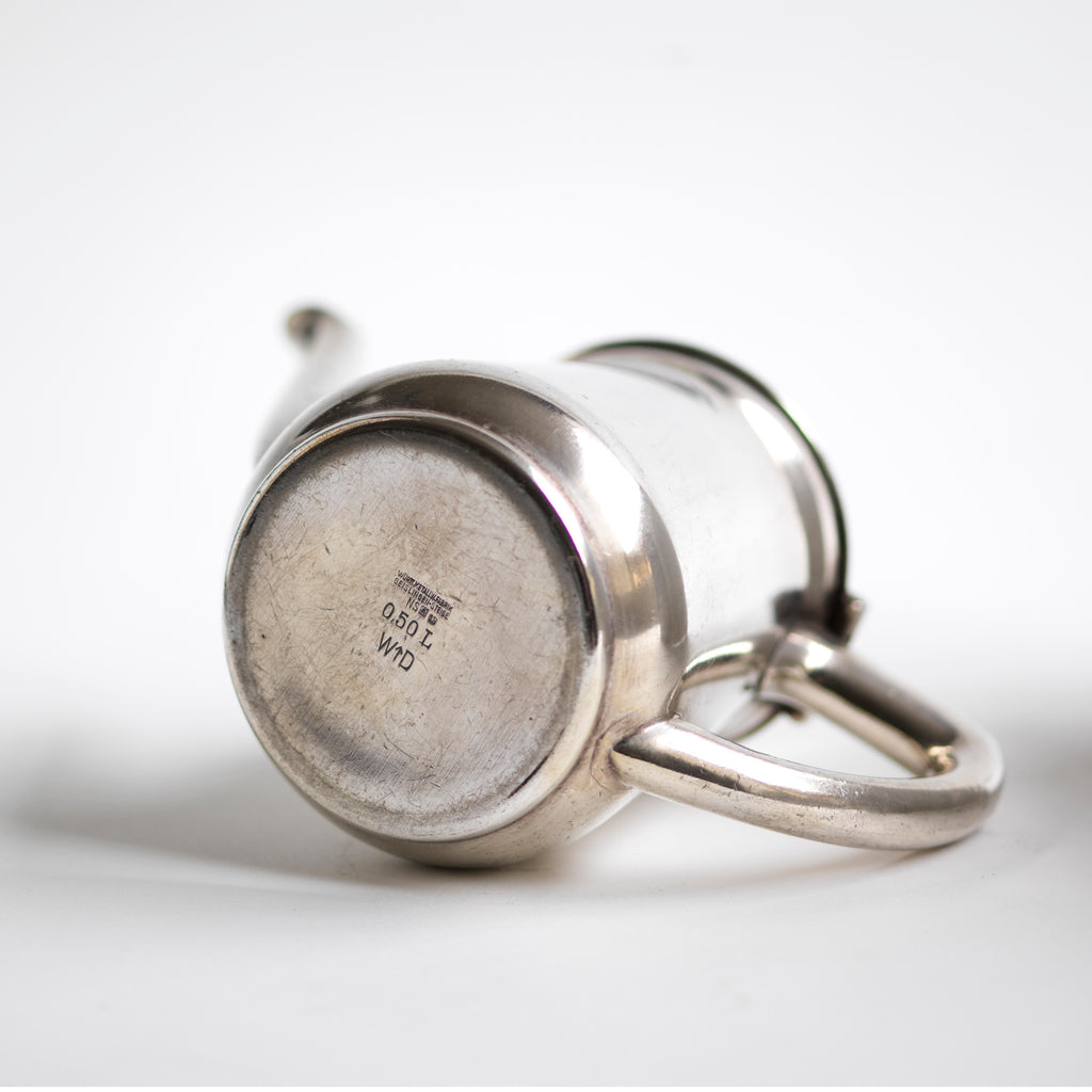 By 1950, silverplated tableware and cutlery accounted for two thirds of WMF's turnover. There was also an increase in the volume of trade in household and kitchenware items between WMF and specialist retail shops, along with the production of an extensive range of plated silver ware for the hotel and catering industry – such as this handsome officer’s mess teapot.