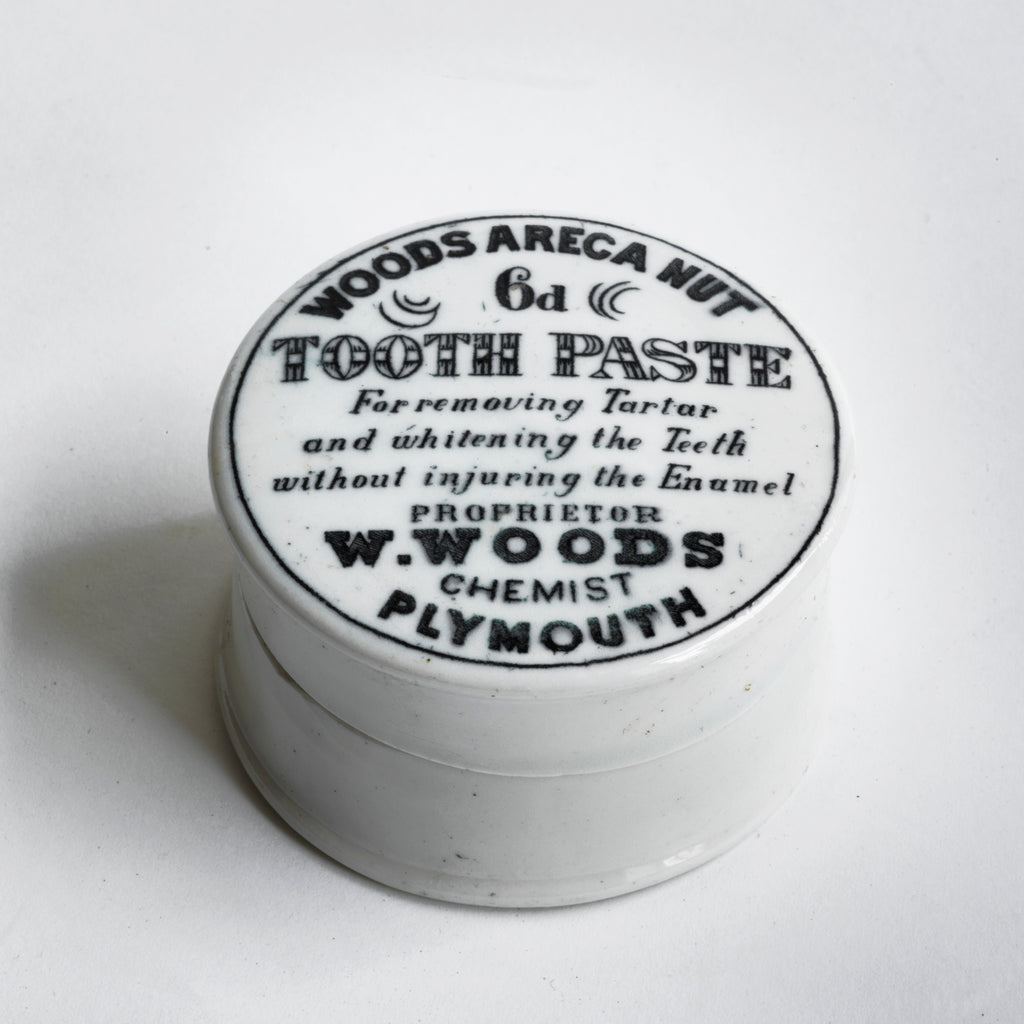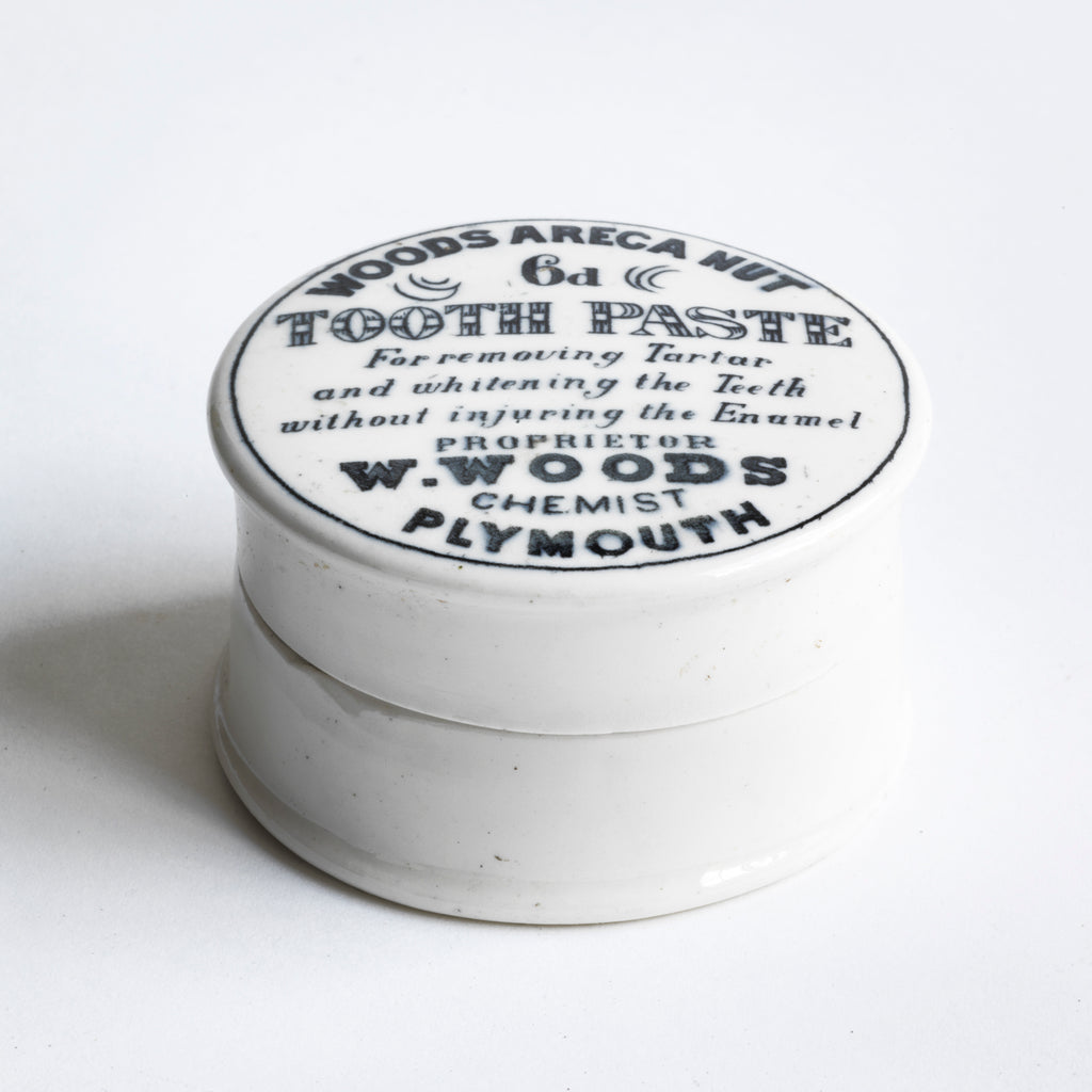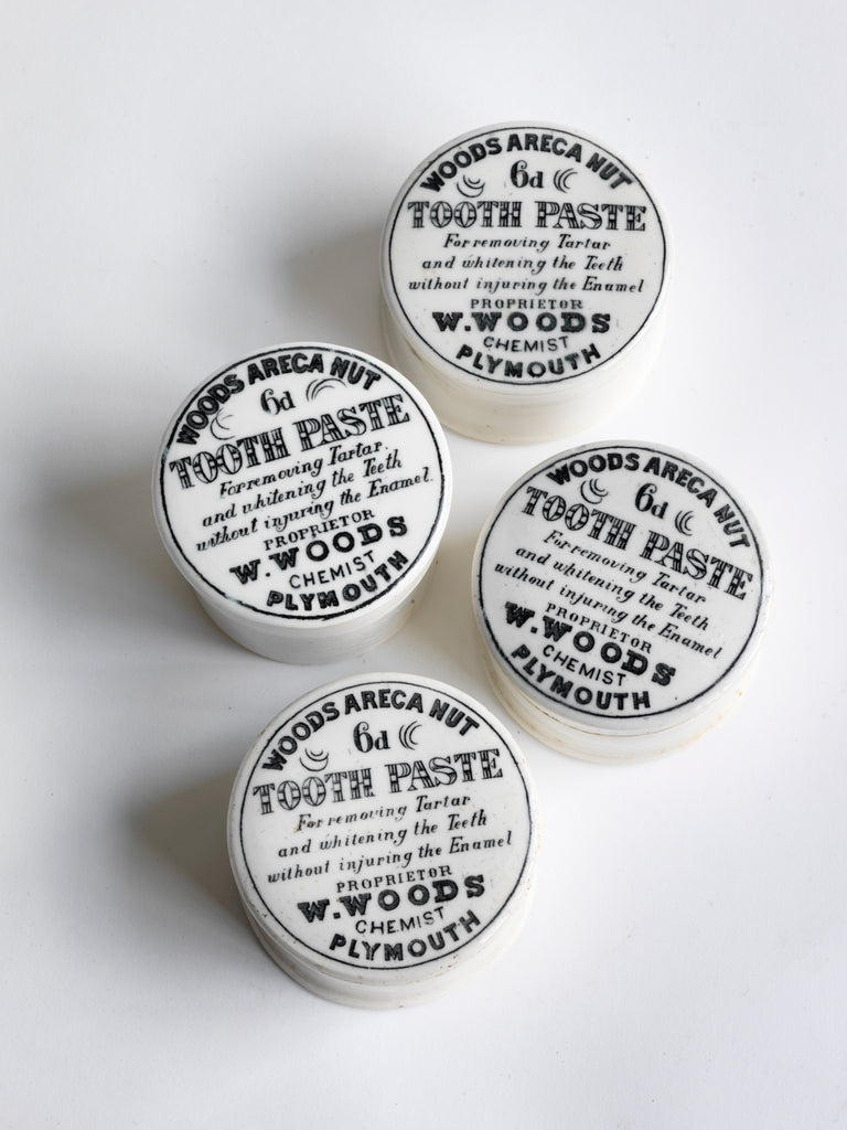 We have sourced a small collection of Victorian chemist's tooth paste pots with lids. Each lid is exquisitely designed and bears all of the proprietor's information in black and white: "Woods Areca Nut 6d Tooth Paste - For removing Tartar and whitening the Teeth without injuring the Enamel. Propretor W. Woods Chemist Plymouth"