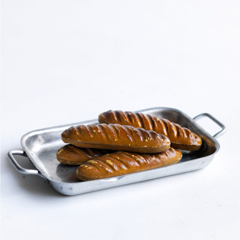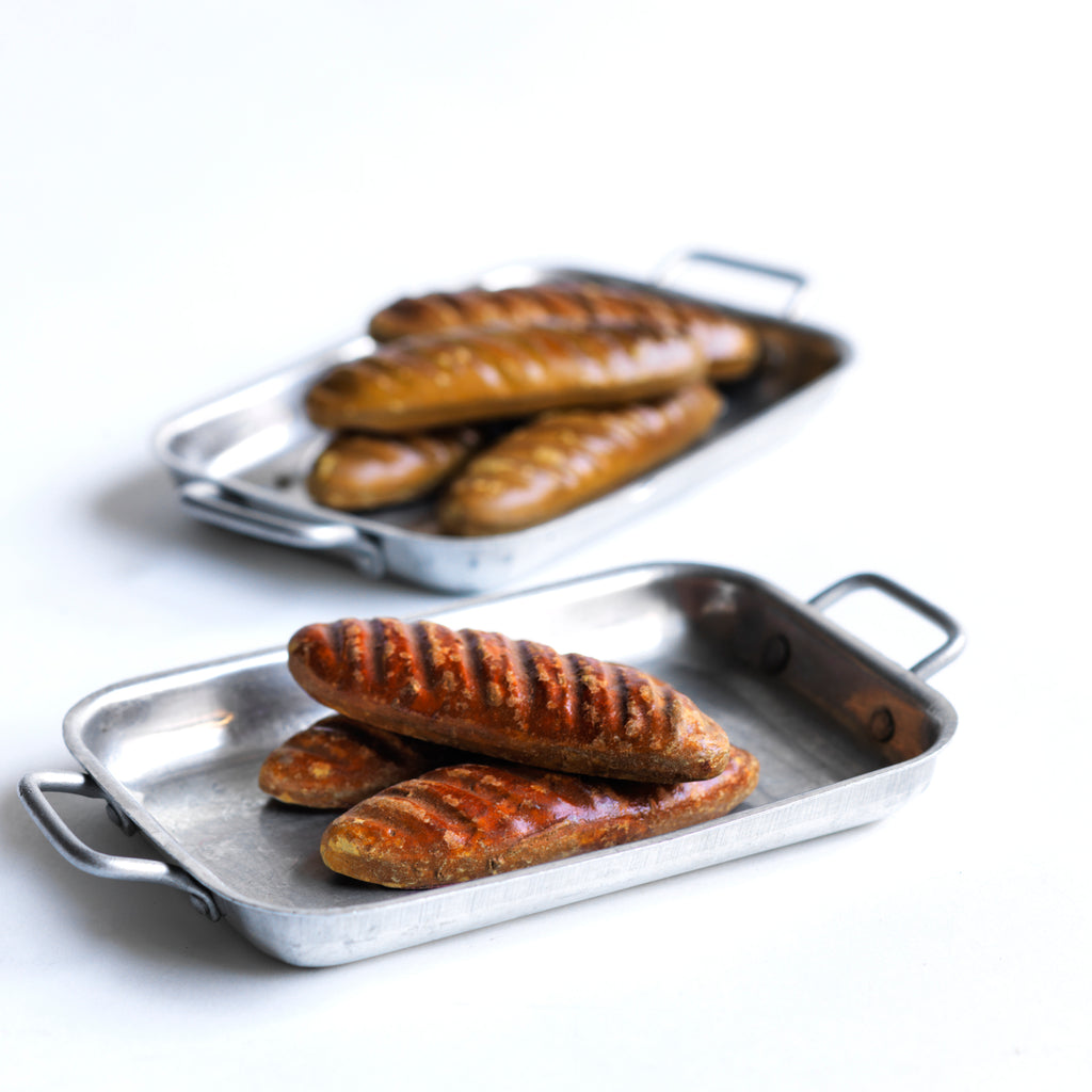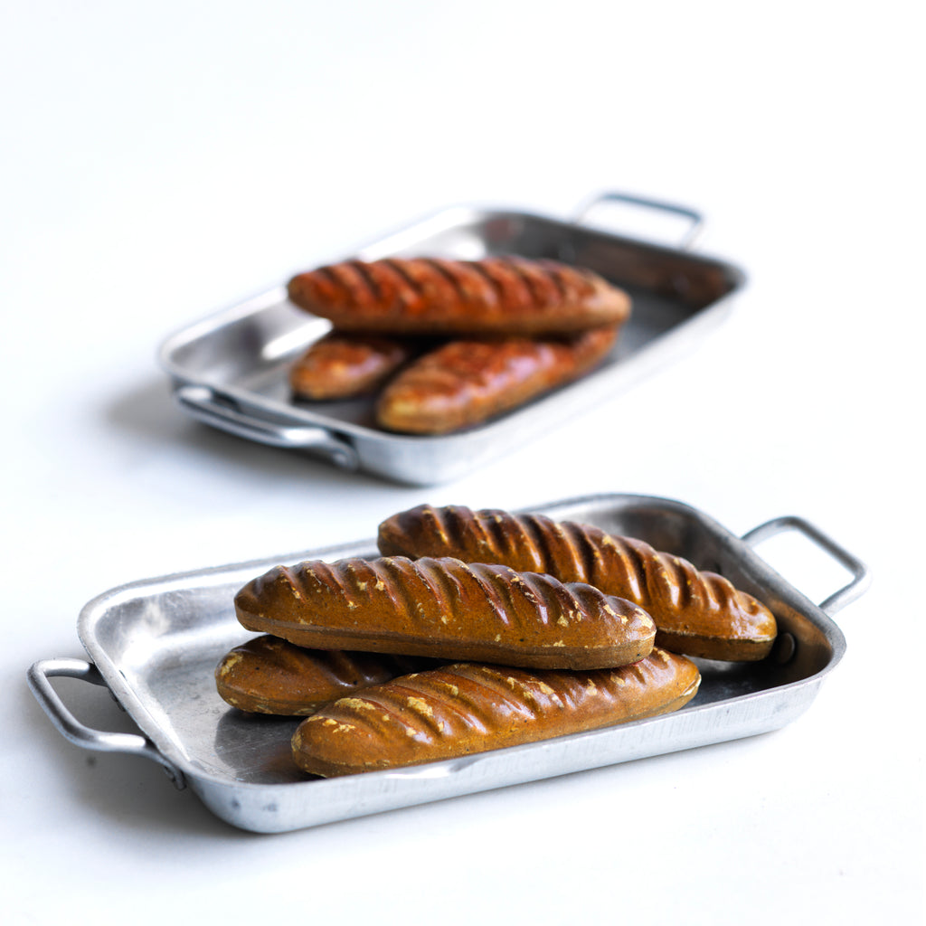 A charming collection of vintage doll's house bloomer style loaves with slashed baked tops; a set of aluminium baking / roasting pans with handles; and a fat little burnished roast chicken - all with their original painted finish, and modelled from a composition plaster material.