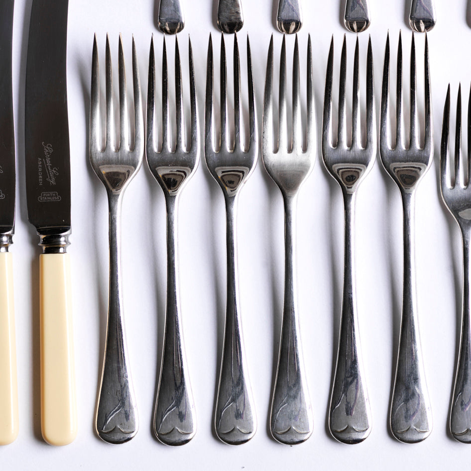 A plate of good food is lost without a good knife and fork. Well-proportioned, well-balanced and beautifully designed flatware is a joy to use and is the making of a good meal. Our vintage ‘bone-handled’ knives are both good-looking and functional, and their renewed popularity make them a stylish addition on today’s table. The knives have ivorine handles fashioned from xylonite, and have high-polished stainless steel blades. All forks and spoons are silver-plated EPNS (electro-plated nickel silver).
