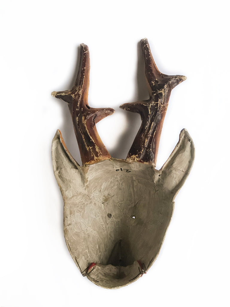 A beautiful and very rare 1930s papier-mache theatre mask of a deer head that looks like it has come straight out of an early twentieth century rendition of a Midsummer Night's Dream. The underside of the muzzle is hinged and is controlled by a spring, opening and closing by the actor's jaw as he speaks, and it is with its original paint. It would make a stunning wall decoration.