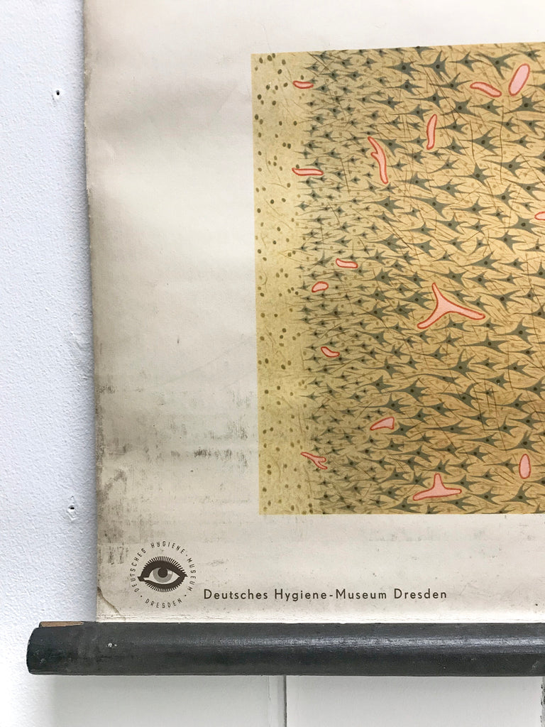 A large and rare science lab learning aid with illustrations of the human brain and its vascular system, depicted whole and in cross-section. Manufactured in the 1950s by the German Hygiene Museum, this highly illustrative anatomical chart makes for a strong and graphic wall hanging.