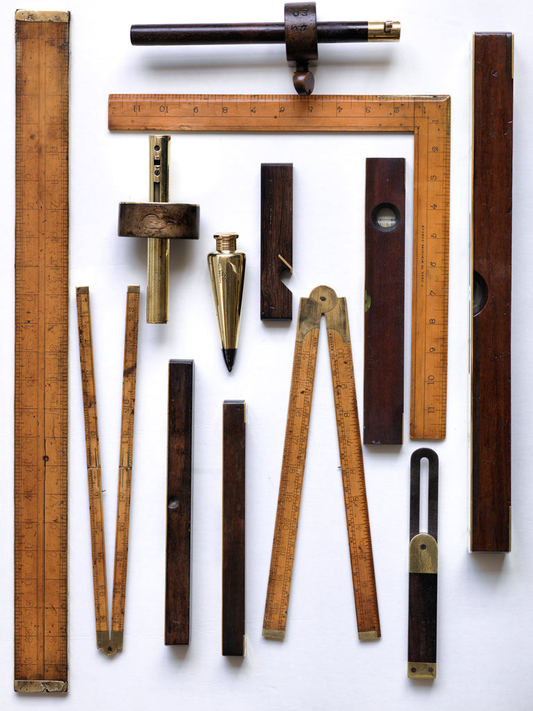 A wonderful collection of handmade 1930s vintage and antique brass bound carpenter's tools by Chesterman, Rabone & Sons of Birmingham, and Preston & Sons of Sheffield; including marking and mortice gauges, plumb bobs, hinged and extending rules, rulers, and brass plated spirit levels. All in excellent condition, with beautiful patina and in good working order.