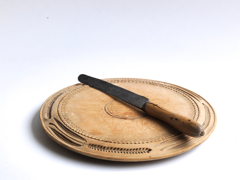 A Victorian bread board and bread knife, each carved with stylised wheat-sheaf motifs. The bread board is of sycamore, richly carved, and sits on three flattened bun feet. The knife has a wheat sheaf patterned handle with "Bread" carved near to its end; which is fitted to a carbon steel blade, marked "Adams Bros, Folkestone & Dover'. The knife has been much loved, has a wonderful polished patina, and the letters BREAD are now but ghosts in the wood.