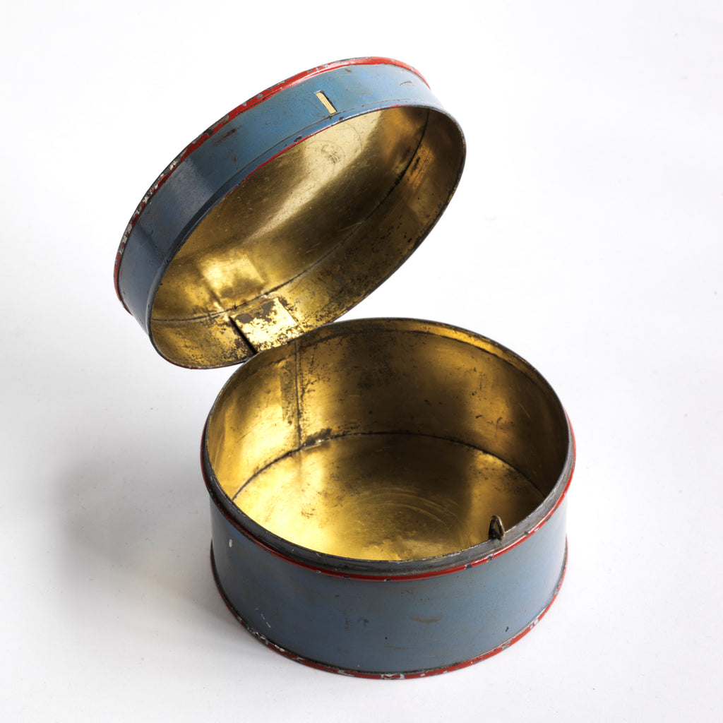 A neat little Edwardian tin collar box with a metallic gold interior and a hinged and fastened lid. The exterior has its original grey painted finish with red trim, and "Collars" in black painted lettering on top. A handy tin for keeping things tidy on the hall table, such as keys and loose change.