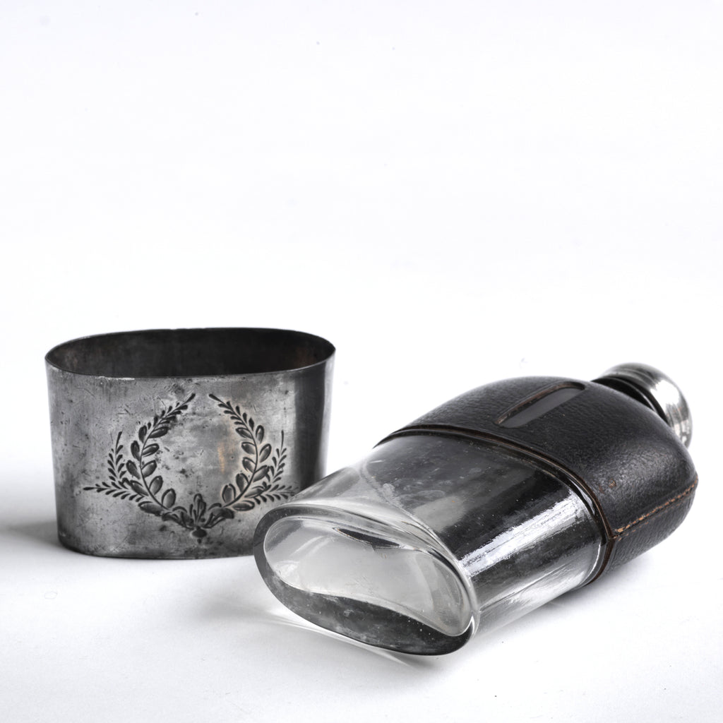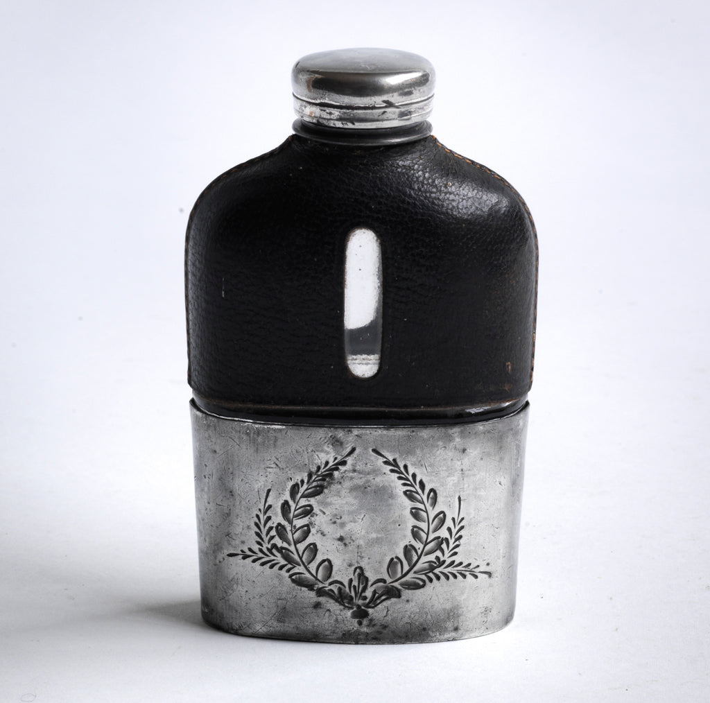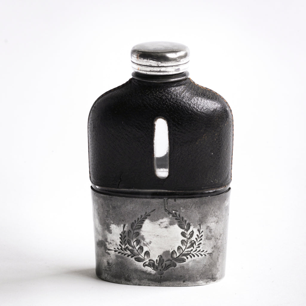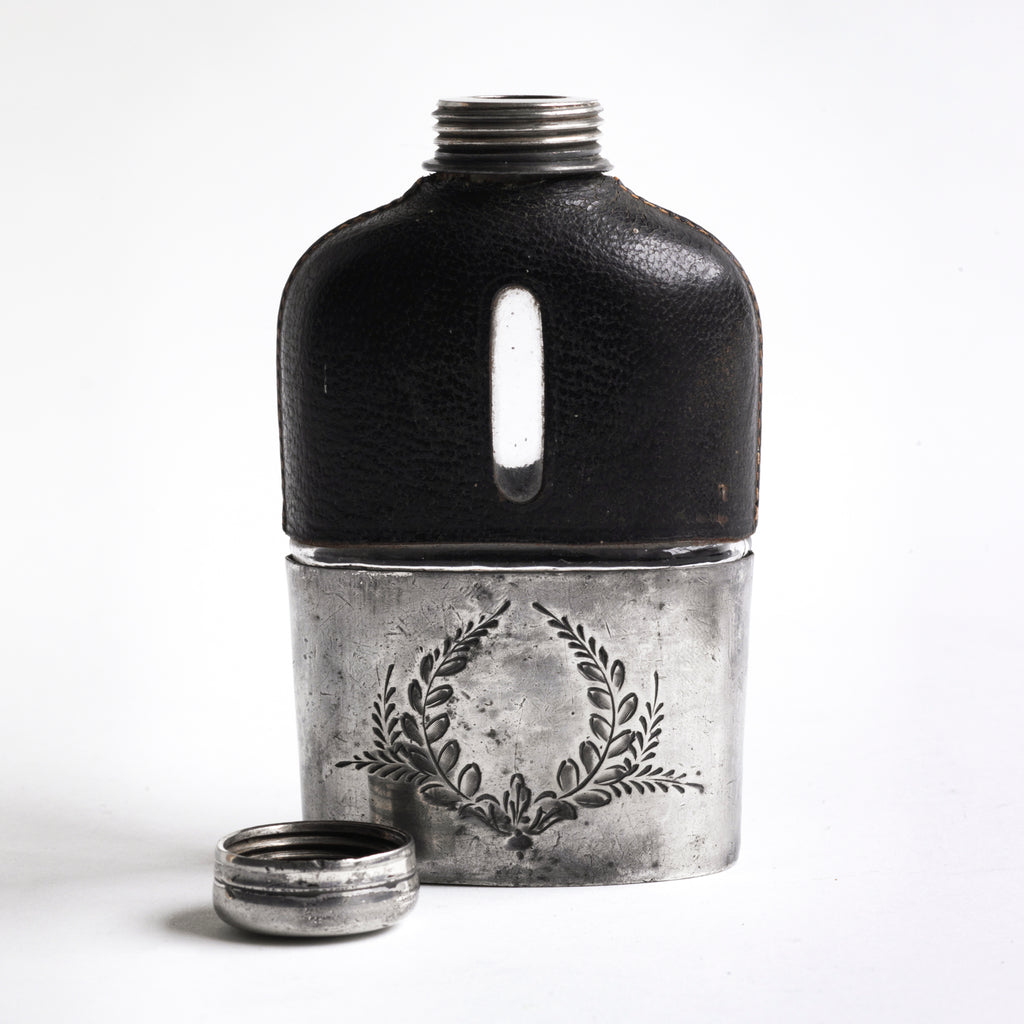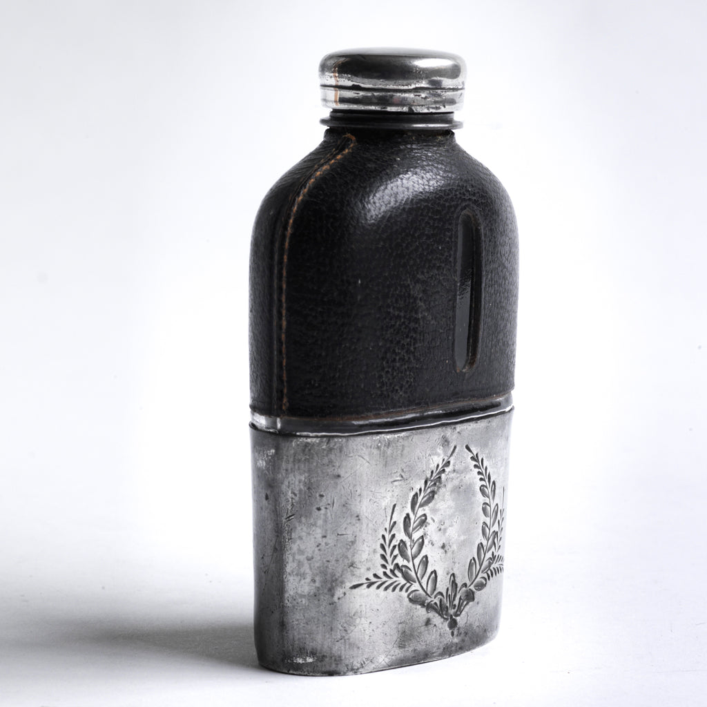 A quality Edwardian silver plated, glass and black leather hip flask with a screw-cap top, and beautiful leaf decoration etched into the silver plate. The clear glass body is half covered with leather, the lower half has a detachable silver plated cover that also acts as a cup. See images.