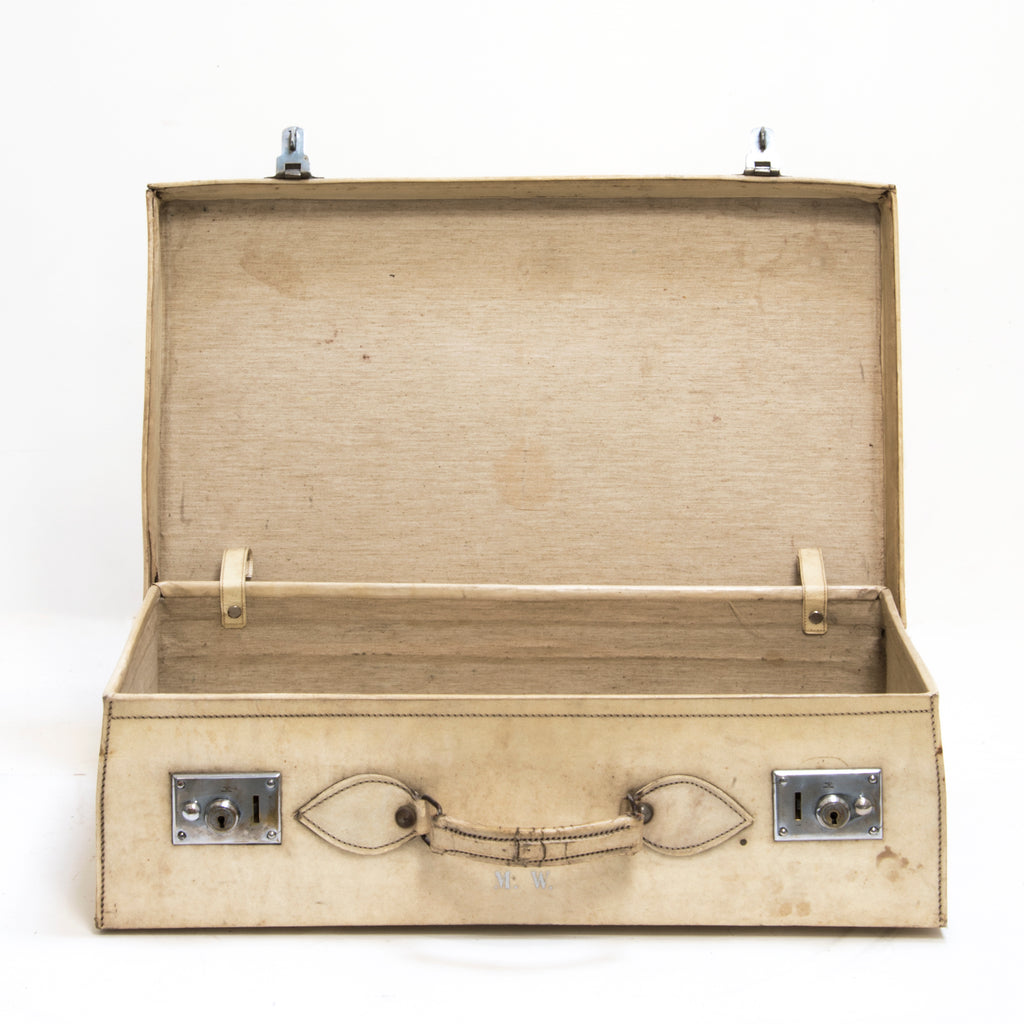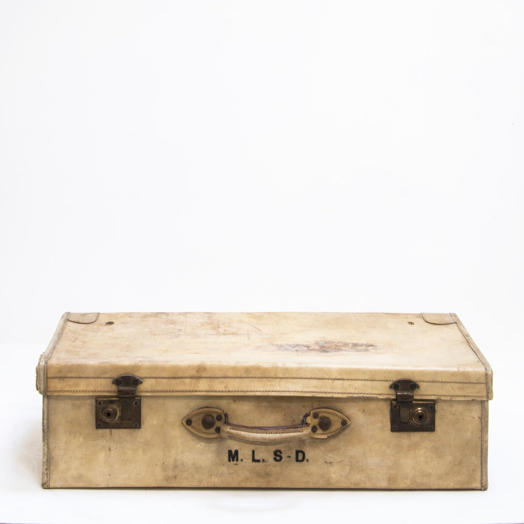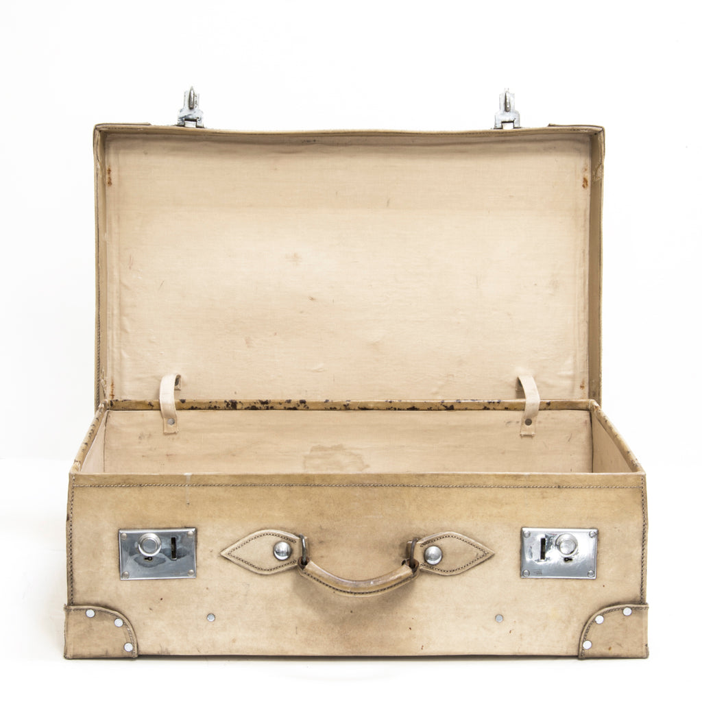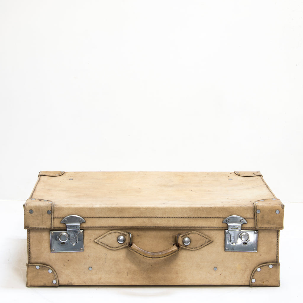 Just one left! A collection of glamorous 1920s vellum luggage made from bleached cowhide and fitted with nickel plated fittings, and each monogrammed with the owner's initials. Quality, first-class luggage of its day; one can but wonder what grand tours and travels they have seen. Their days of travel are over, yet now they are perfect for bedroom blanket, clothes or shoe storage, and make very handsome low level coffee-tables. We are selling these suitcases separately, please make your choice in the box below.