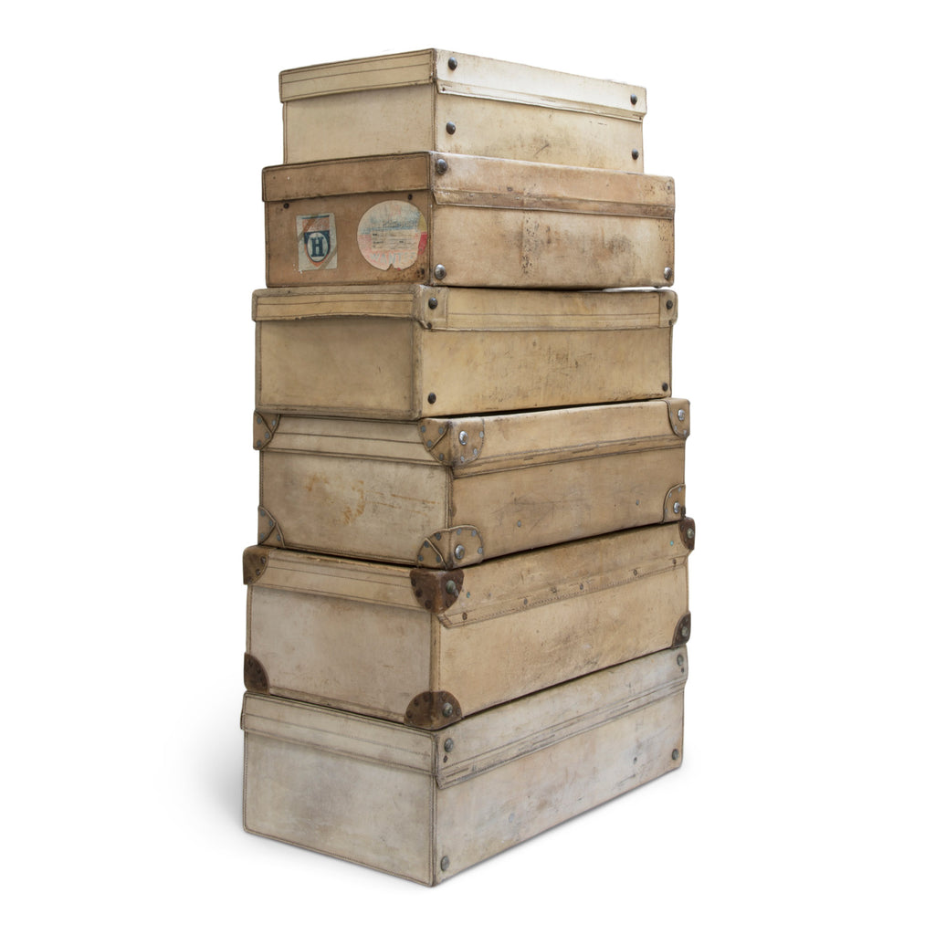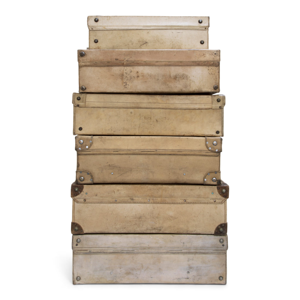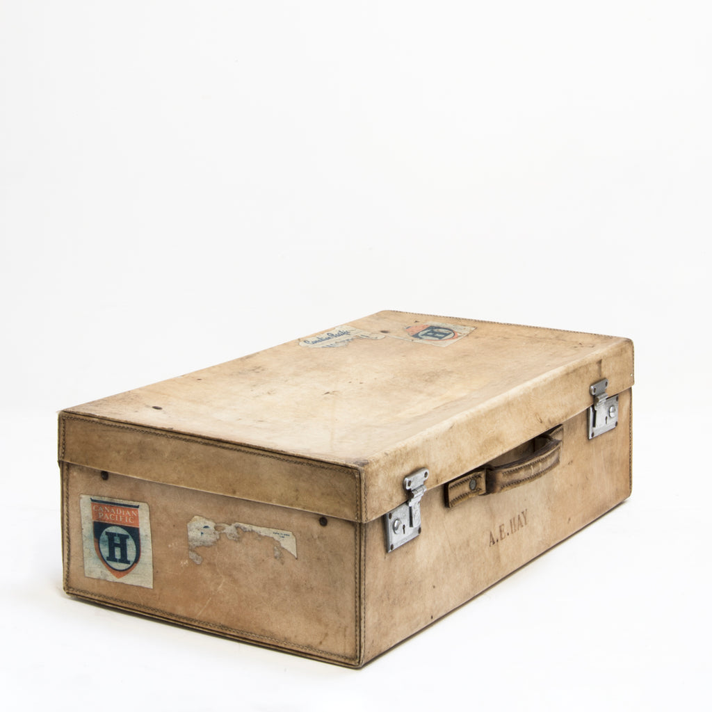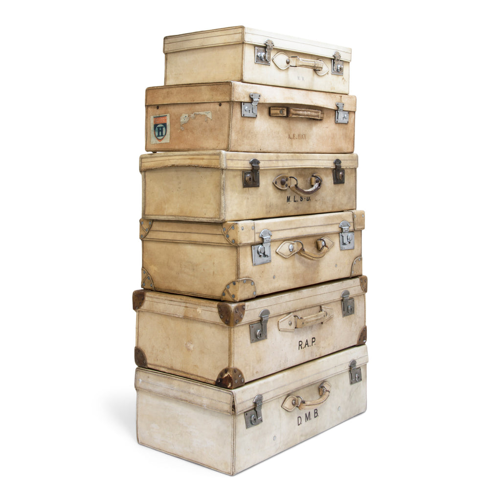 Just one left! A collection of glamorous 1920s vellum luggage made from bleached cowhide and fitted with nickel plated fittings, and each monogrammed with the owner's initials. Quality, first-class luggage of its day; one can but wonder what grand tours and travels they have seen. Their days of travel are over, yet now they are perfect for bedroom blanket, clothes or shoe storage, and make very handsome low level coffee-tables. We are selling these suitcases separately, please make your choice in the box below.