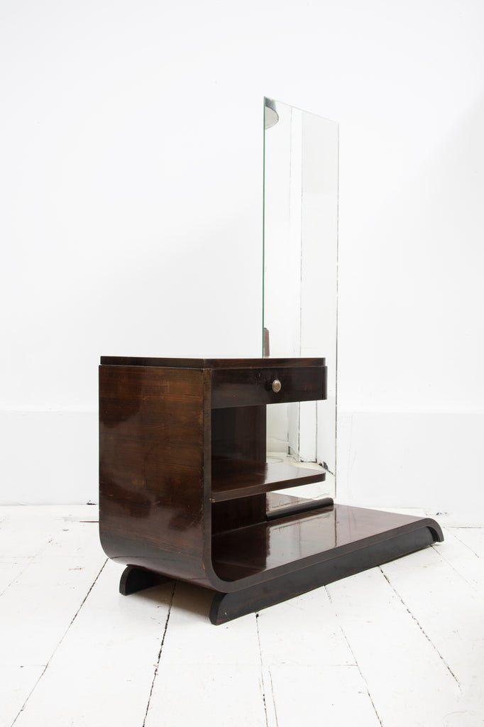 A striking geometric French Art Deco dressing table of good 1930s design; and similar to designs produced by the king of French Deco cabinet makers, Emile Jacques Ruhlmann, for the English cosmetics retailer Yardley. The dressing table is fitted with a single drawer, under-shelf and full height plate-glass mirror, and is of classic L-shaped Modernist form with curved plinth base. And in true French Art Deco style, it is finished in a macassar-like dark veneer that has a high mirror French polish finish. It would make a purposeful addition to a contemporary bedroom or hallway, for it has a full height mirror and some discreetly elegant storage.