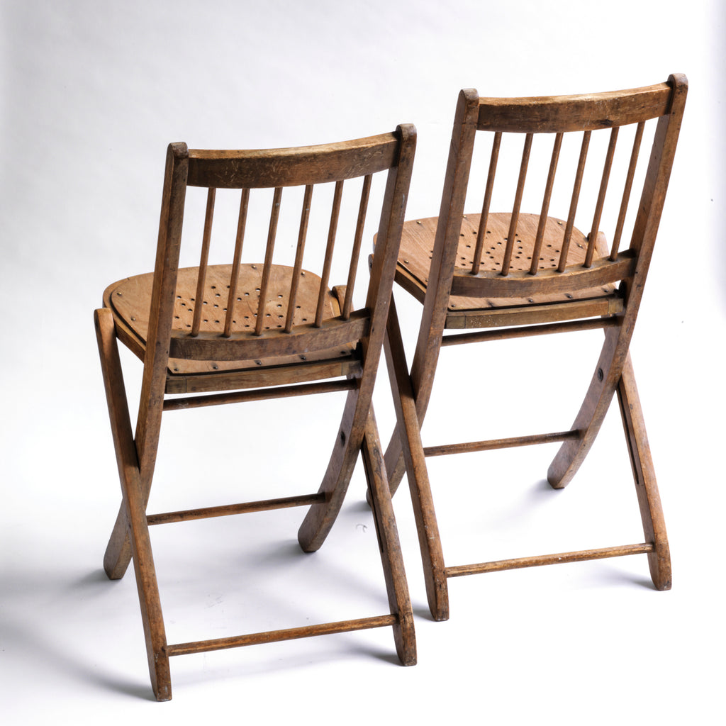 The seats are of ply with pierced patterns, and are affixed by small brass studs. The backs are spindle slatted, whereas later versions of this chair were not slatted. Each frame is beautifully constructed from solid walnut and designed to fold flat when not in use, and so can easily be stored. They make excellent dining chairs, and we are selling them singularly.
