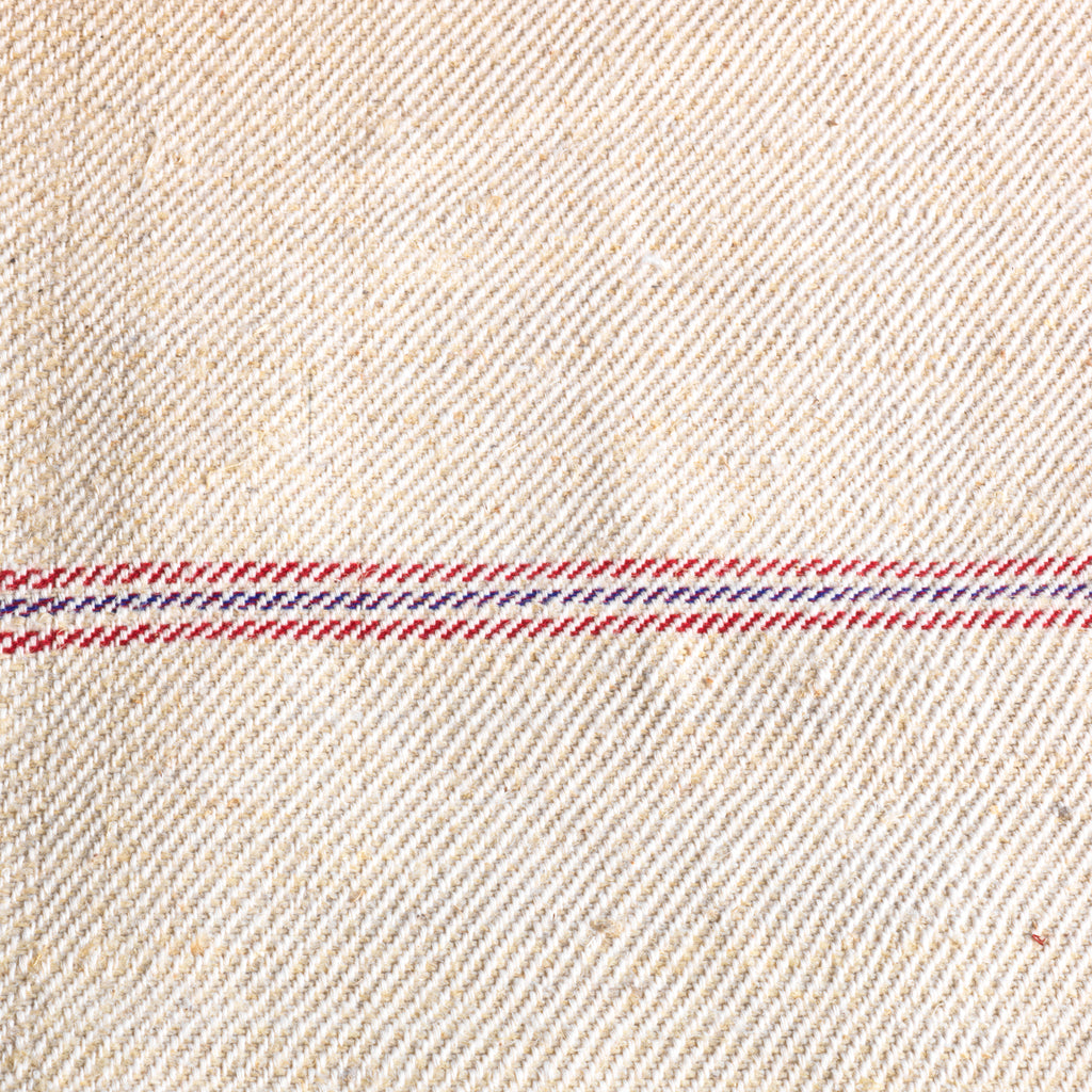 A bolt of rustic, slubby vintage linen with intermittent cross stripes: a triple red stripe and a red and violet cross-hatch stripe are spaced every 39cm crossways. A straw-coloured linen thread is interwoven randomly throughout lending it a further rustic feel. Excellent used as a table runner, for covering chairs, to make cushion covers or as a stair runner.