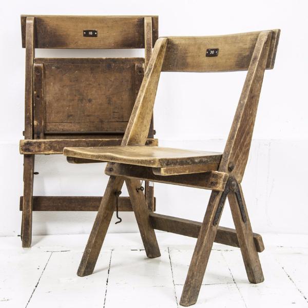 A collection of very good-looking cricket pavilion chairs, each with a small enamel number affixed to its back (numbers 16 to 24). Each is beautifully constructed of solid beech and designed to fold flat when not in use, and so can easily be stored.