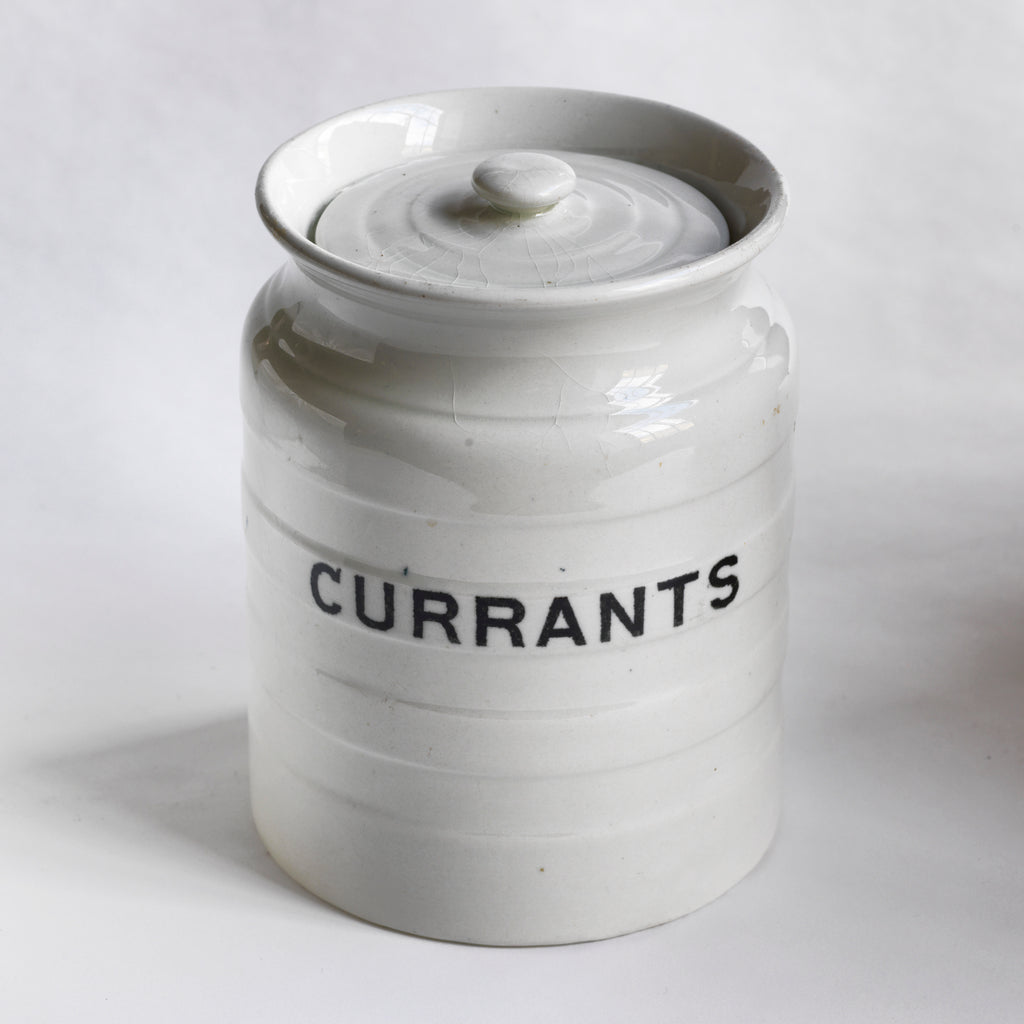 A handsome 1920s ironstone food canister with lid, banded body, and striking "Currants" typeface. Despite its everyday usage, it is in wonderful condition.