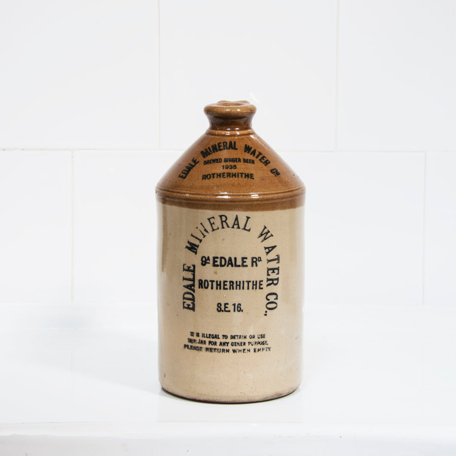 A handsome 1930s flagon with strap handle and bold utilitarian typeface: "Edale Mineral Water Co Brewed Ginger Beer 1935 9a Edale Rd Rotherhithe S.E.16 - it is illegal to detain or use this jar for any other purpose, please return when empty". It is part of a private collection, which we have recently purchased - all of which we are offering through our online store only (see images).