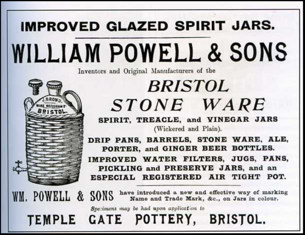 Throughout Victorian Britain, and through to the 1930s, hand-thrown glazed stoneware vessels were used for the transportation and storage of liquids such as beer, wine, vinegar and mineral water. Not wanting to miss an opportunity to advertise themselves, grocers, brewers and dealers had their trade names transferred onto their flagons and bottles - often along with instruction to return their empty vessels (see images). By the nineteenth century the flagon-making industry was dominated by two Bristol based companies, Powell and Price; and in 1906 Price absorbed their rival Powell and the firm became Price, Powell & Co, remaining in business until the mid-twentieth century, when glass and plastics finally took over.