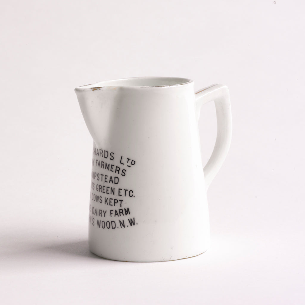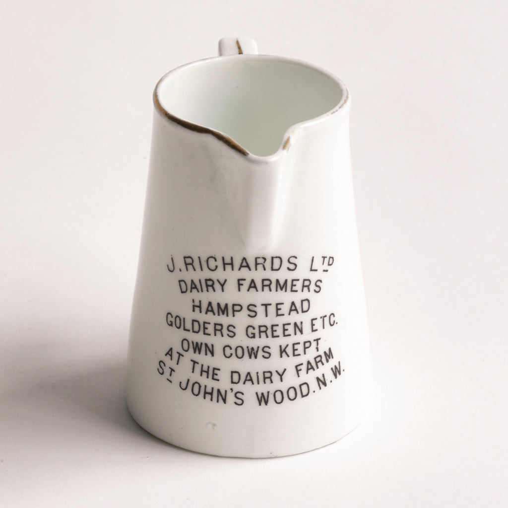 A wonderful and rare little advertising jug for a dairy farm that existed in St John's Wood London - and we're talking 120 years ago. To the front reads "J. Richards Ltd Dairy Farmers Hampstead Golders Green Etc Own Cows Kept At The Dairy Farm St John's Wood N.W."