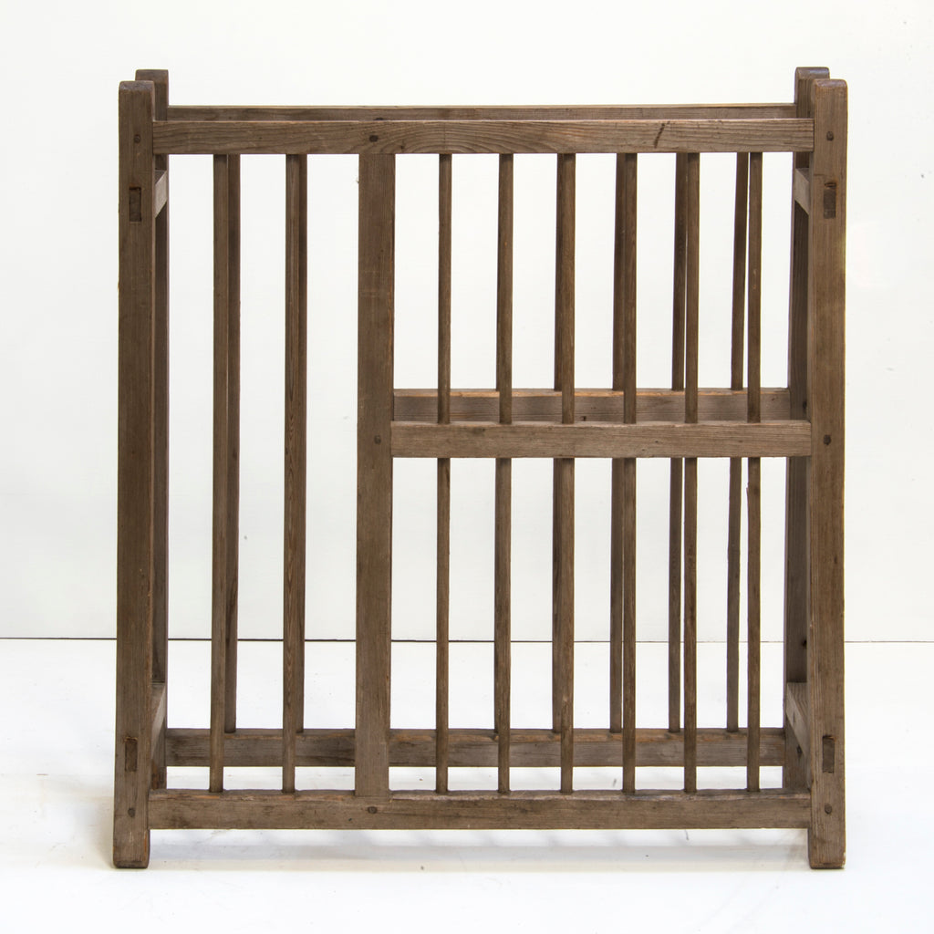 A good Edwardian scrubbed pine plate draining rack which can either be surface stood or wall mounted. Pots and bowls can be put to drain upside down on its top bars, and there is a section for large meat platters and roasting trays. It will hold modern-day large, deep dinner plates comfortably.