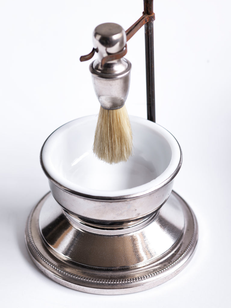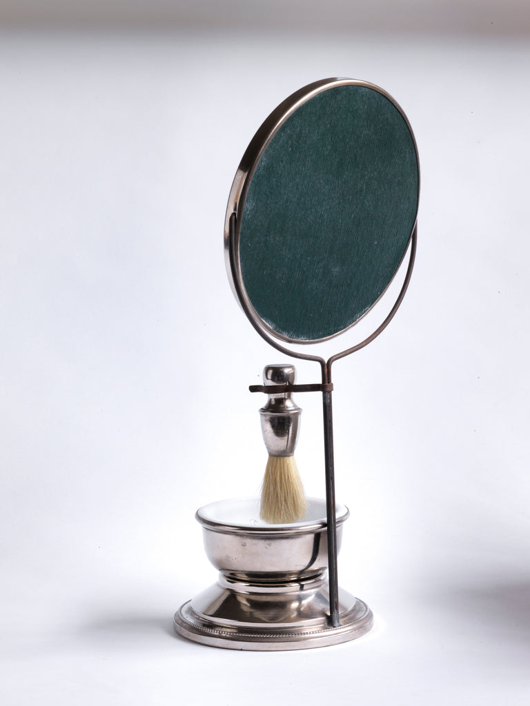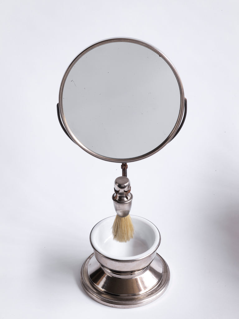 A good-looking Edwardian gentleman's shaving companion, consisting of a pivoting circular mirror set on a stand, a badger hair shaving brush and a white vitrolite glass bowl set in a nickel plated bowl-shaped stand. It was most likely made for travel, as it is light-weight and small, and therefore very transportable.