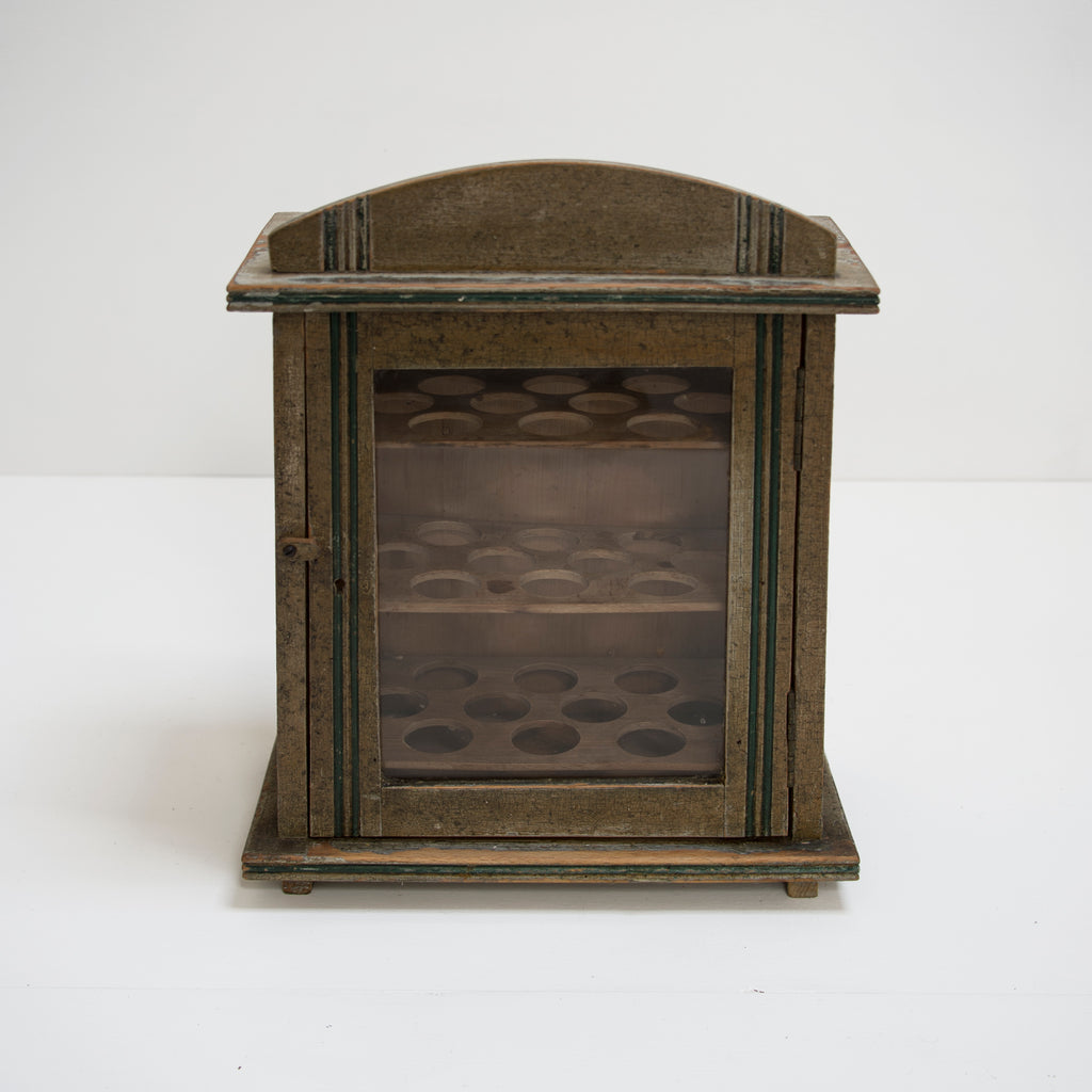 A charming Edwardian table-top egg cabinet fitted with three shelves and a glazed door, and with its original painted finish. The sides have wooden bars to allow for air flow and the base is mounted on shallow feet. It holds 30 eggs.