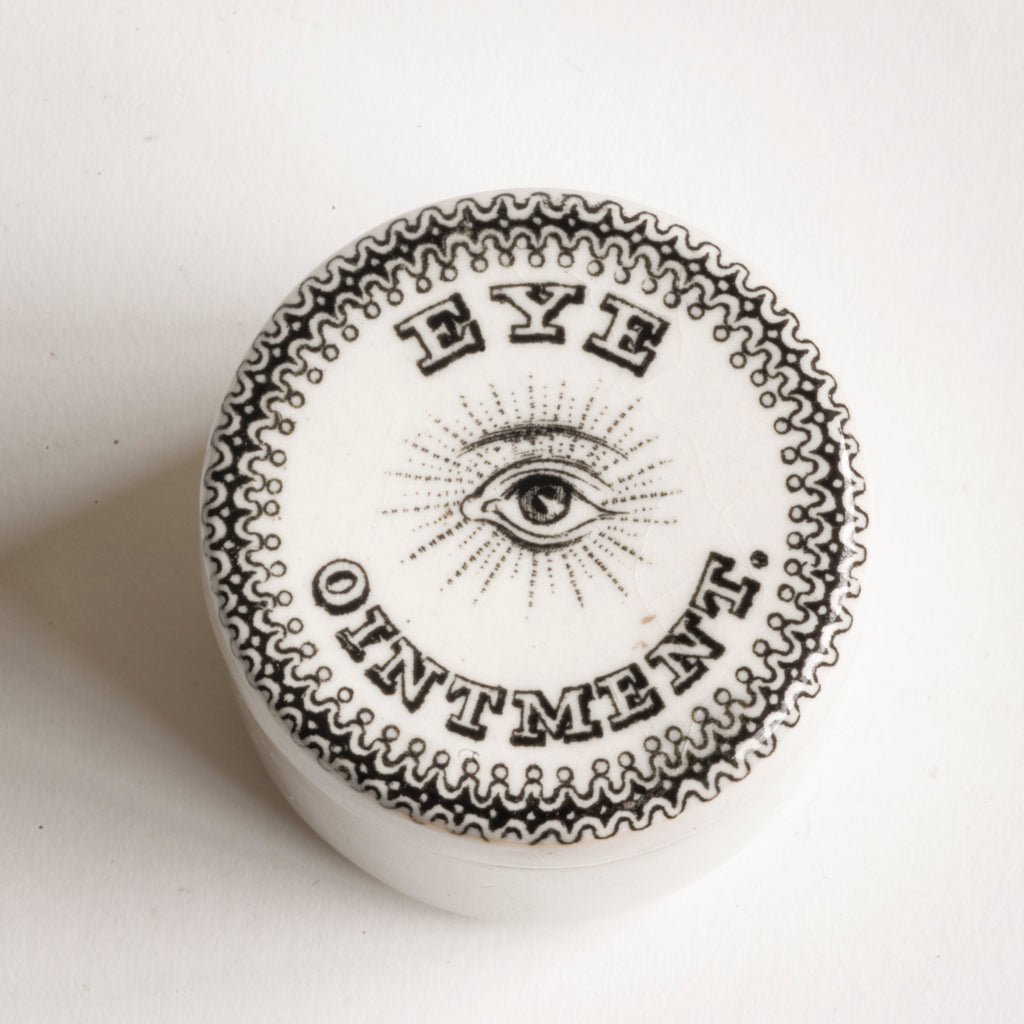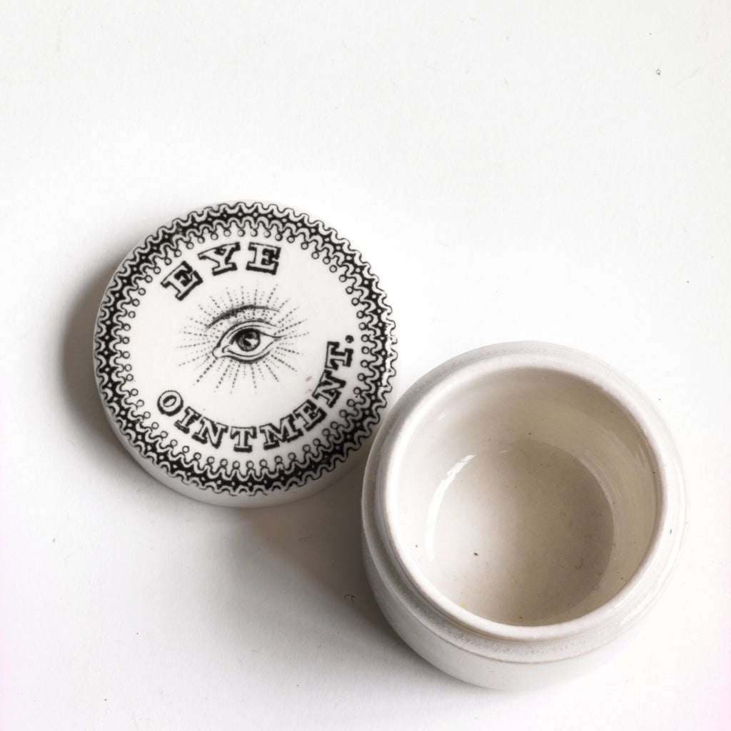 A rare Edwardian ironstone eye ointment pot with over-glazed transfer print of an eye, "Eye Ointment" typography and a decorative border - and all in immaculate condition. This fabulous tiny transfer-ware ointment pot or crock dates to the turn of the century. It once contained a miraculous salve; an ointment made and sold by Chemists and well known "snake oil" salesmen. The product of course was shear quackery.