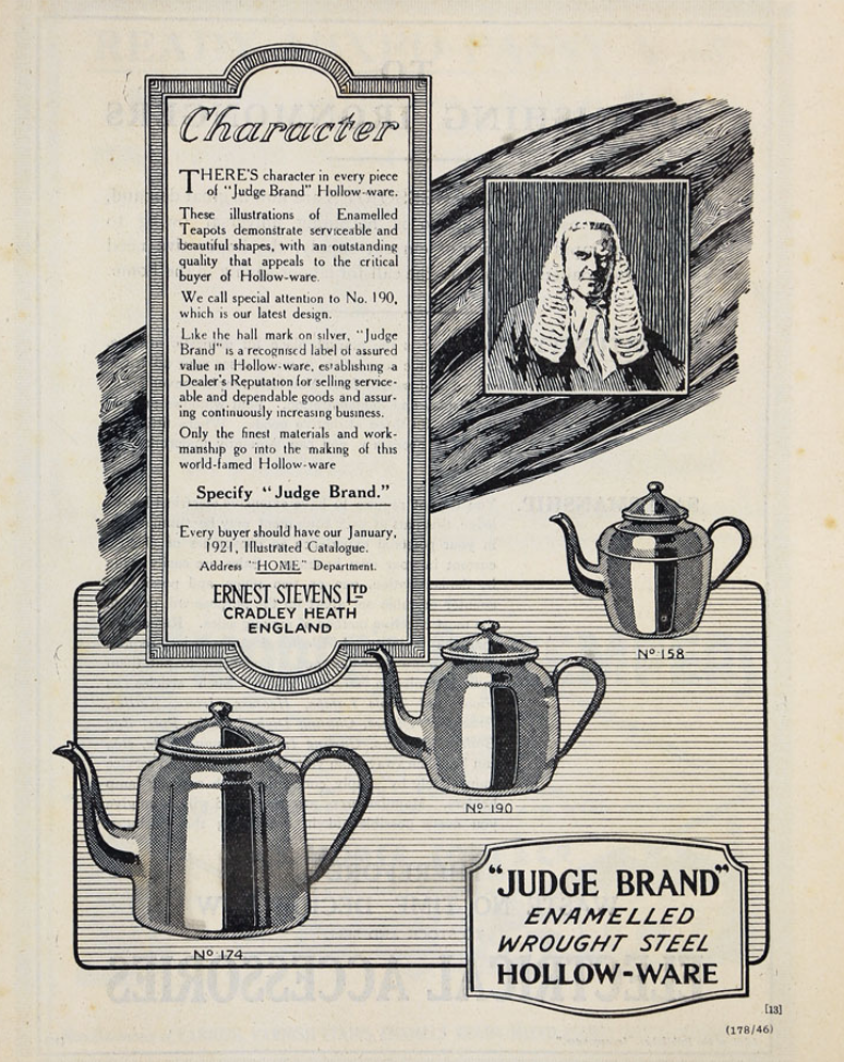 A good serviceable early British brown enamel teapot, capable of delivering around 12 plus cups of tea. This one was made by Judge Brand hollow ware, who manufactured kitchen enamelware throughout the early twentieth century. It is identified by its distinctive Judge's logo applied to the knob on its lid. Judge Ware was manufactured by Ernest Stevens Limited, Cradley Heath, Staffordshire, UK, who boasted "Only the finest materials and workmanship go into the making of this world famed hollow-ware". They were right, the Judge brand has stood the test of time and still offers the best in vintage household enamelware.