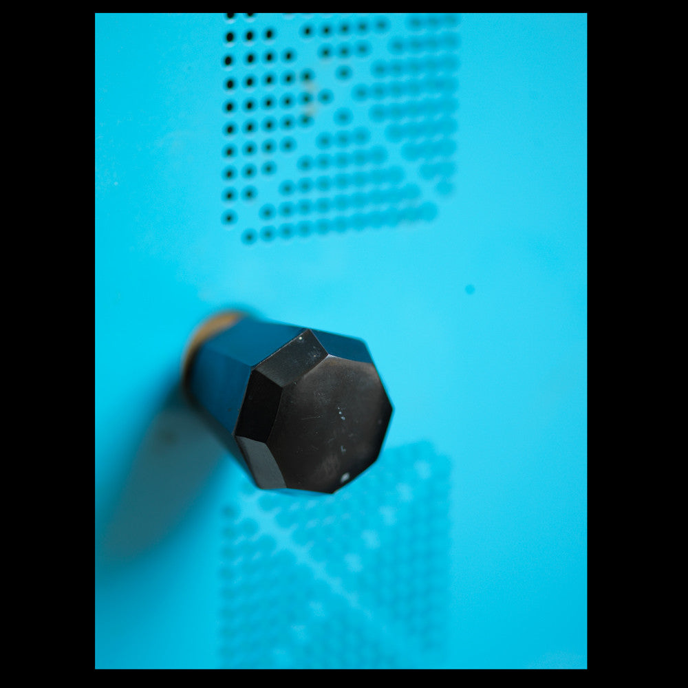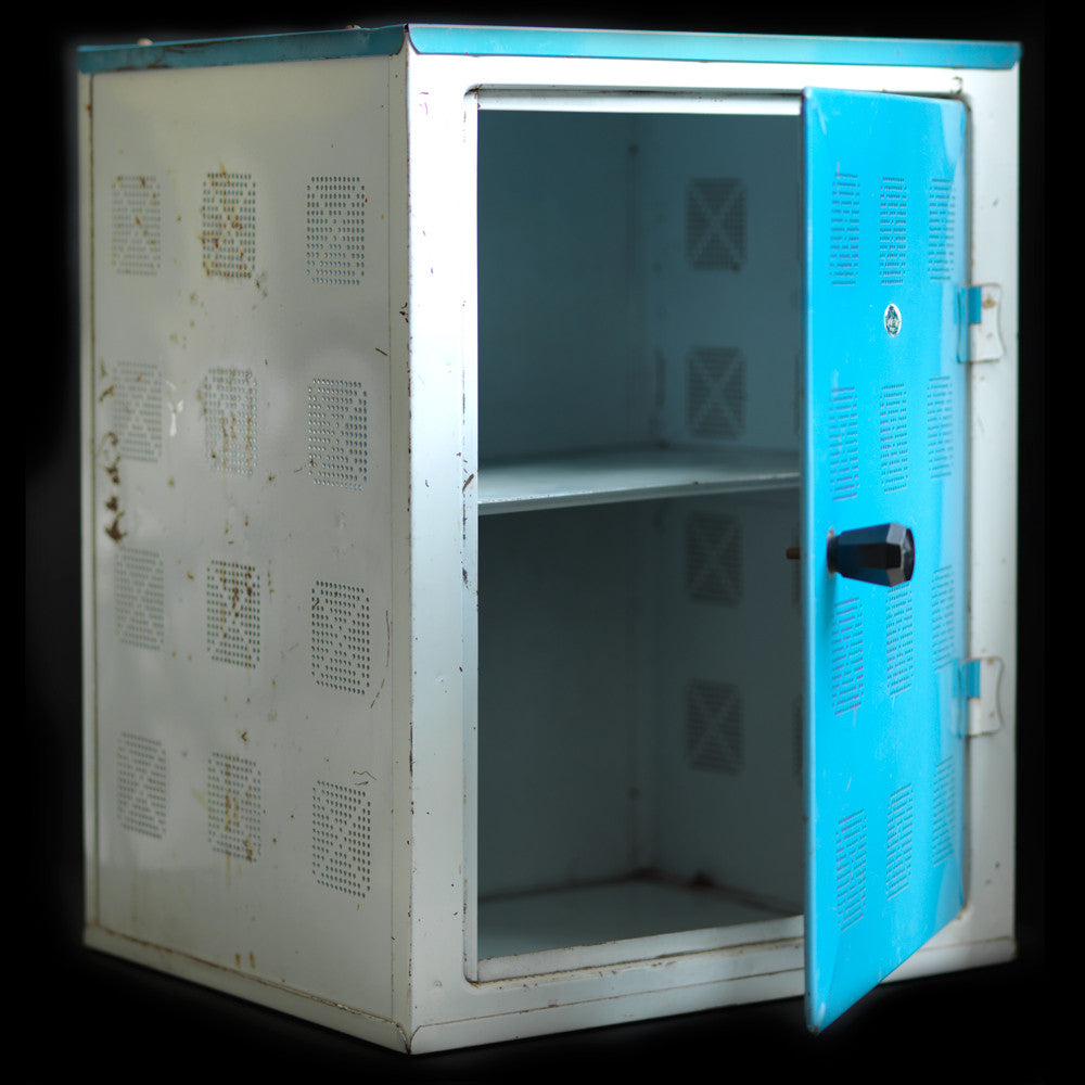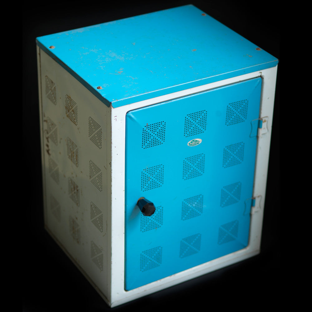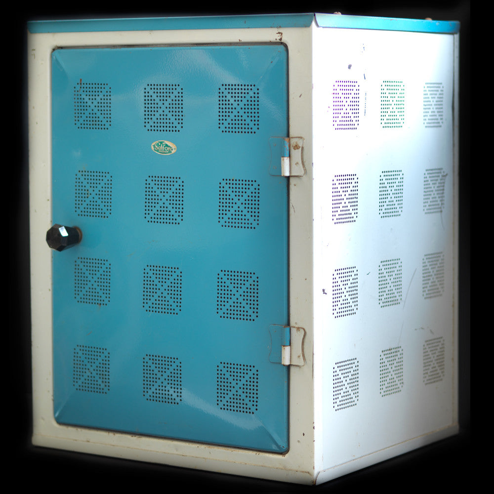 A Salford food safe with original blue and white enamel paint finish. It has perforated sides and door, a Bakelite handle and a removable internal shelf. Its original purpose, before the days of the refrigerator, was for the storage of meat, cooked cold-cuts, milk, butter and leftovers. It would make an ideal kitchen or bathroom cupboard.