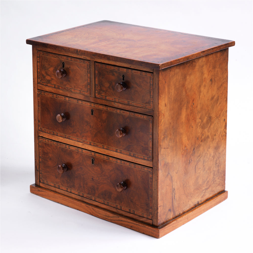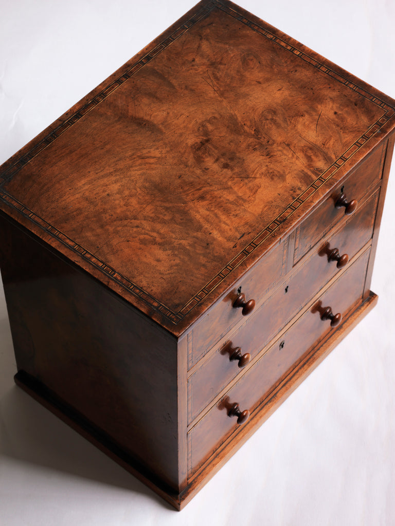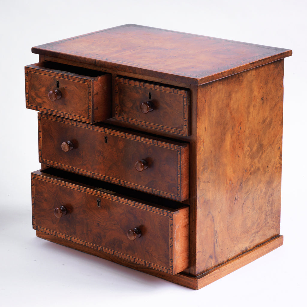 Miniature furniture was made by apprentices, to showcase their cabinetry skills; and it was also used by travelling salesman, as scaled-down sample pieces of the types of furniture and finish that could be applied back in the workshop. This mini chest of drawers could have served such a purpose.